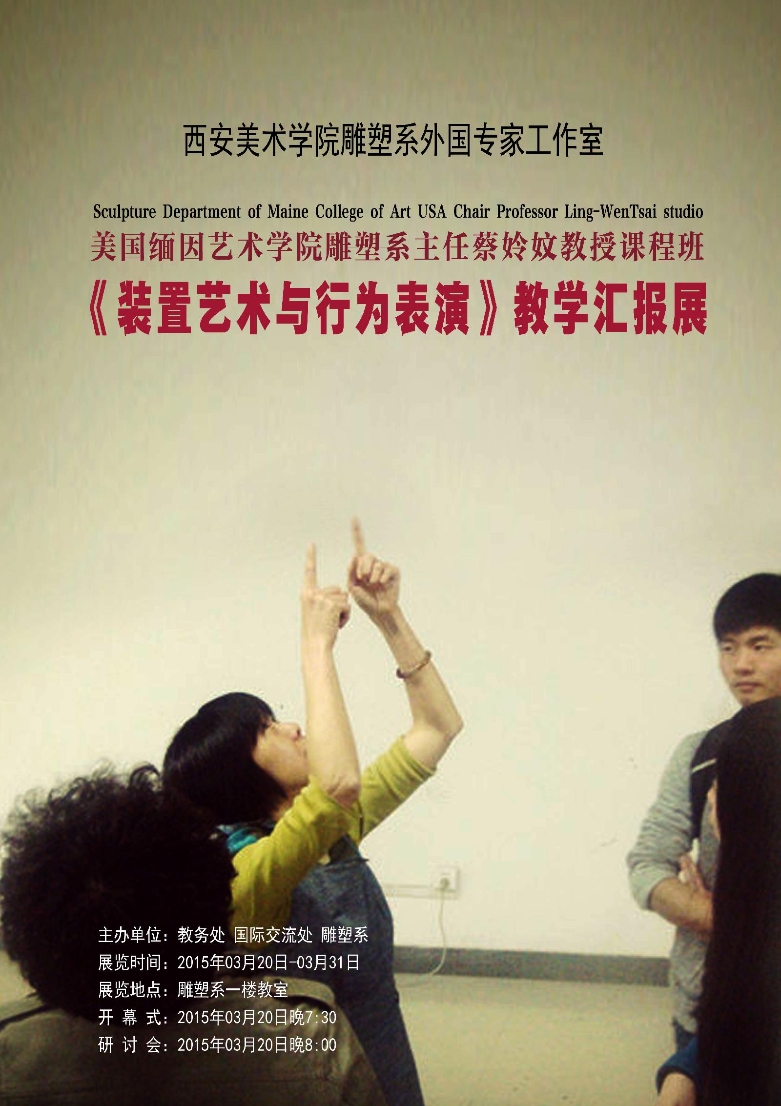 西安美术学院雕塑系外国专家工作室,2015年首期教学汇报展于3月22日在雕塑系一楼工作室举行。由来自美国缅因艺术学院的蔡姈妏(Ling-Wen Tsai)教授,为西美雕塑系三年级学生带来了一门题为《装置艺术与行为表演》的专业创作课程,别开生面的教学方式和丰富多彩的前沿资讯为我们的教学注入了新的活力,并极大地激发了学生们的创作思维与探索兴趣。在课程结束时,雕塑系与教务处、国际交流处共同举办了简朴而隆重的结课总结和作品展示活动。