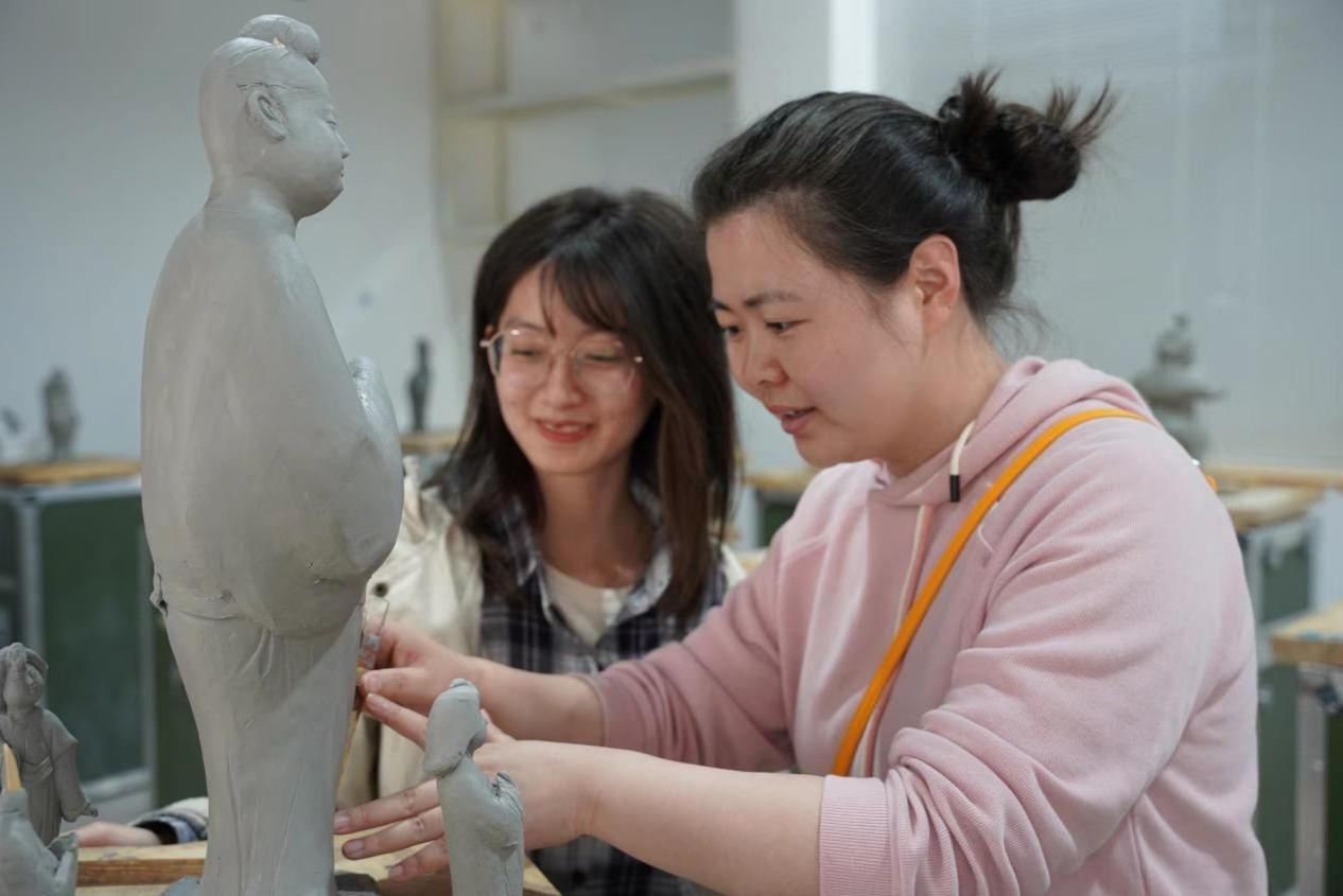 雕塑系首先与西安博物院相关部门领导进行了座谈交流,对西安博物院此次为雕塑系的课堂教学提供的细致全面的支持表示了感谢。在临摹现场,代课教师苗鹏、唐培淞、罗丹汇报了教学情况,对进一步提高古代雕塑临摹课教学质量提出了意见建议。在检查过程中,系领导强调了外出课程的纪律和安全问题,要求同学们要严格遵守教师教学安排,确保教学秩序和个人安全,文明观摩,相互帮助,圆满完成临摹作品。