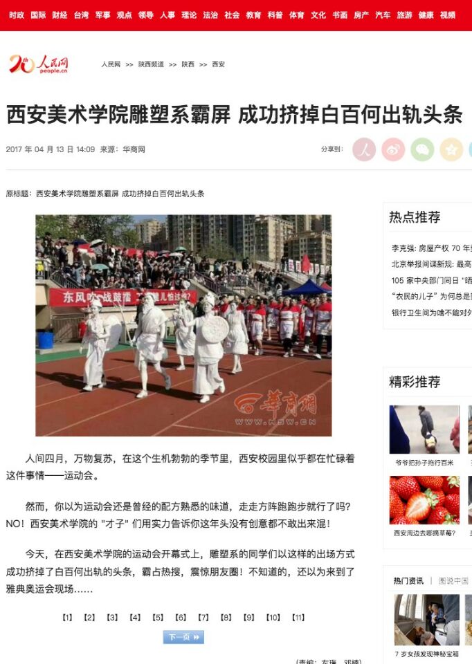在我院召开的2017年运动会上,雕塑系师生发扬团结一致、努力拼搏的进取精神,取得了运动成绩、体育风尚双丰收,展示了优良的师生风貌。特别是在运动会入场式中,雕塑系创意展示的古希腊雕塑造型、运动表演活体雕塑,得到了一致好评,微信传播勇登头条,中央电视台、人民网、青年网、陕西电视台、西安电视台、西安晚报等学院及社会各界媒体广泛宣传,引起了轰动效应,为学院争光,为雕塑系添彩。