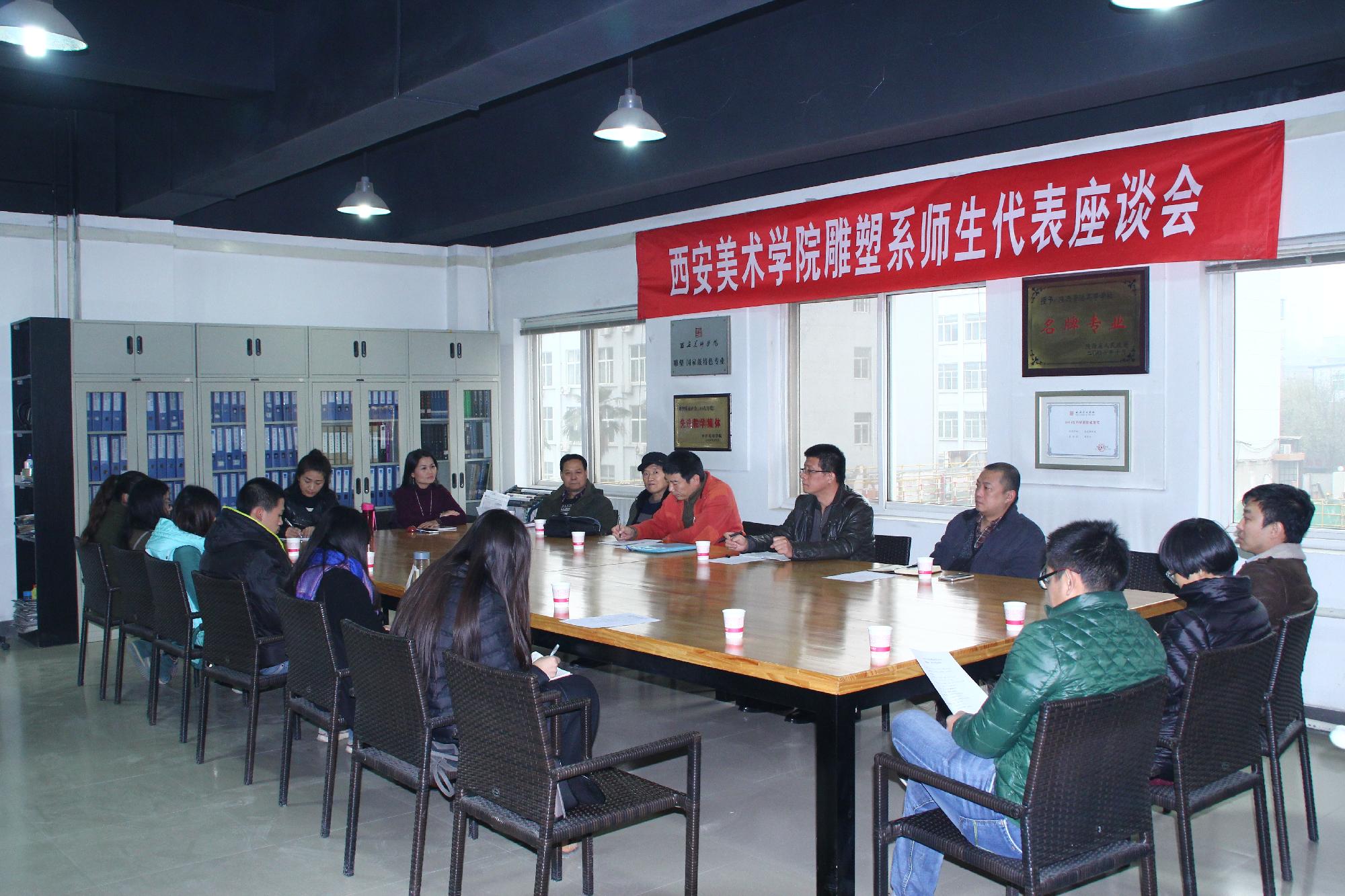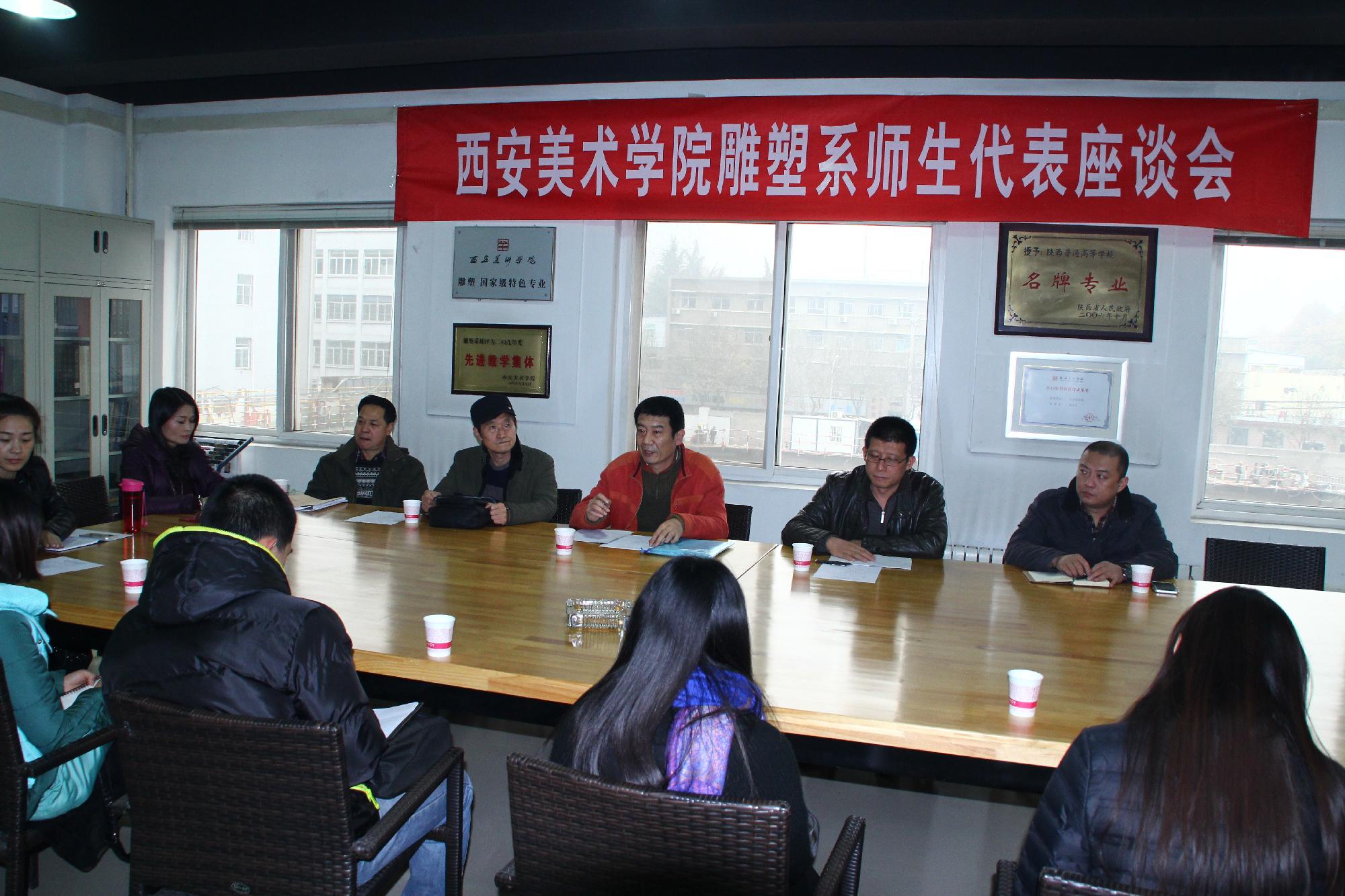 2015年12月8日下午,雕塑系组织部分教师、学生召开了教学质量月“师生代表座谈会”,西安美术学院党委赵万东副书记参加了这次座谈会。座谈会围绕雕塑系教风、学风的改进与提高,教学工作中存在的问题以及雕塑系的长远发展和教学改革进行了广泛深入的座谈。赵万东副书记就雕塑系教学质量、教师管理、学风的自查及重视平时学生有关教学问题的搜集汇总反馈等提出了意见和要求。座谈会上教师与学生分别从各个方面对教学工作提出了意见建议,大家各抒己见,热烈交流,一致表示通过此次座谈会查摆了问题,加强了沟通,密切了师生关系,是对雕塑系今后各项工作的有力促进。