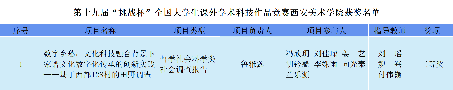 10月31日至11月4日,第十九届“挑战杯”中国移动全国大学生课外学术科技作品竞赛落幕,西安美院《数字乡愁:文化科技融合背景下家谱文化数字化传承的创新实践——基于西部128村的田野调查》在主体赛中斩获三等奖。