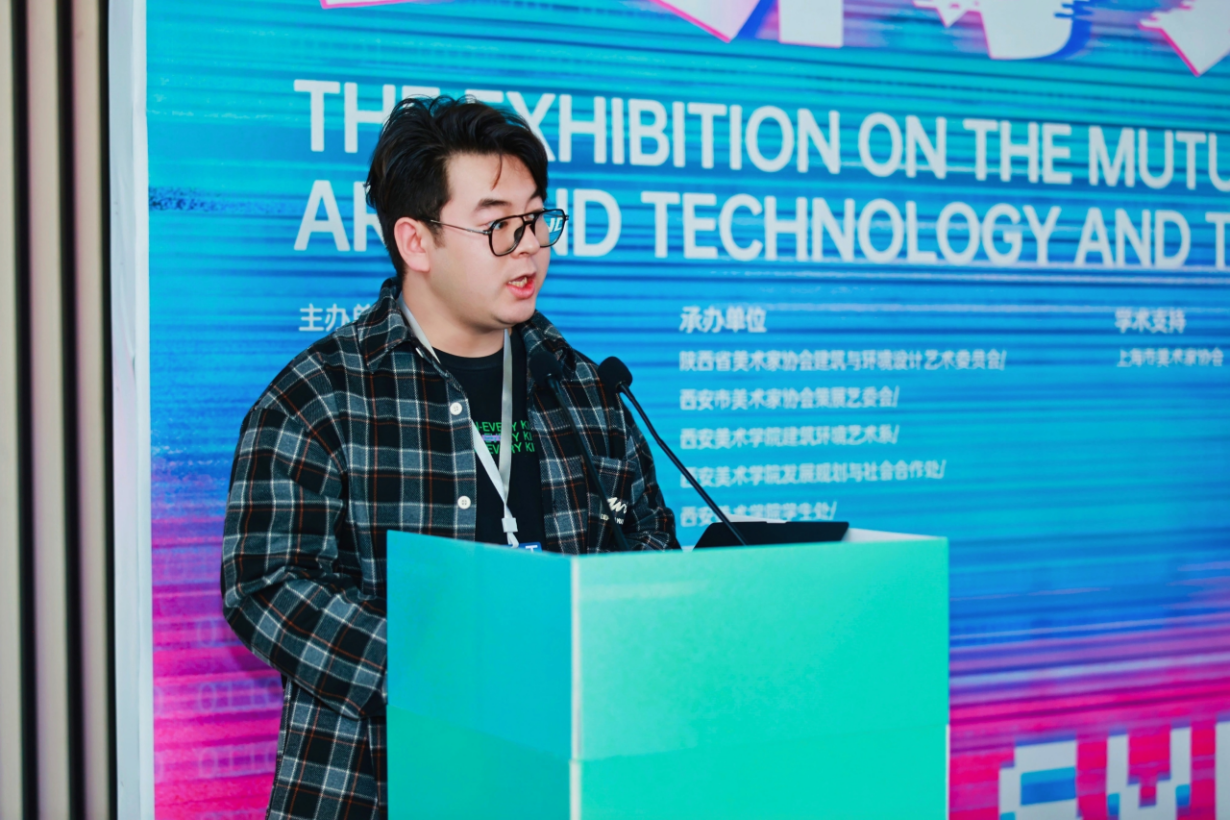参展学生代表任智源从创作实践出发,分享了在AIGC、交互装置等媒介中探索艺术与科技边界的体验,展现了青年一代在交叉学科中的创造力与反思力。