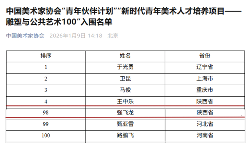 近日,中国美术家协会公布“青年伙伴计划”“新时代青年美术人才培养项目——雕塑与公共艺术100”入选名单。我校雕塑系王中乐、强飞龙2位教师成功入选,为雕塑系学科建设再添佳绩。