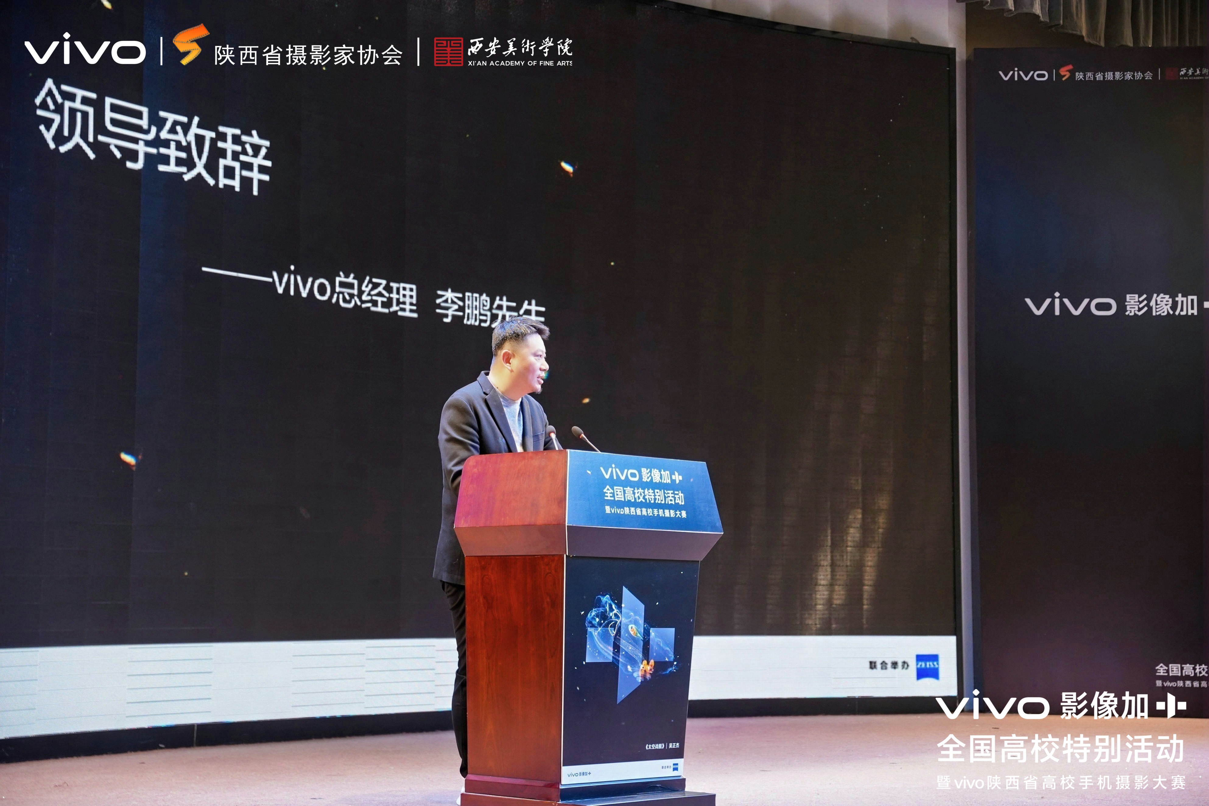 李鹏在致辞中分享了vivo深耕影像领域、携手高校培育青年创作者的合作愿景,表达了vivo以技术赋能青年艺术创作的初心与决心。