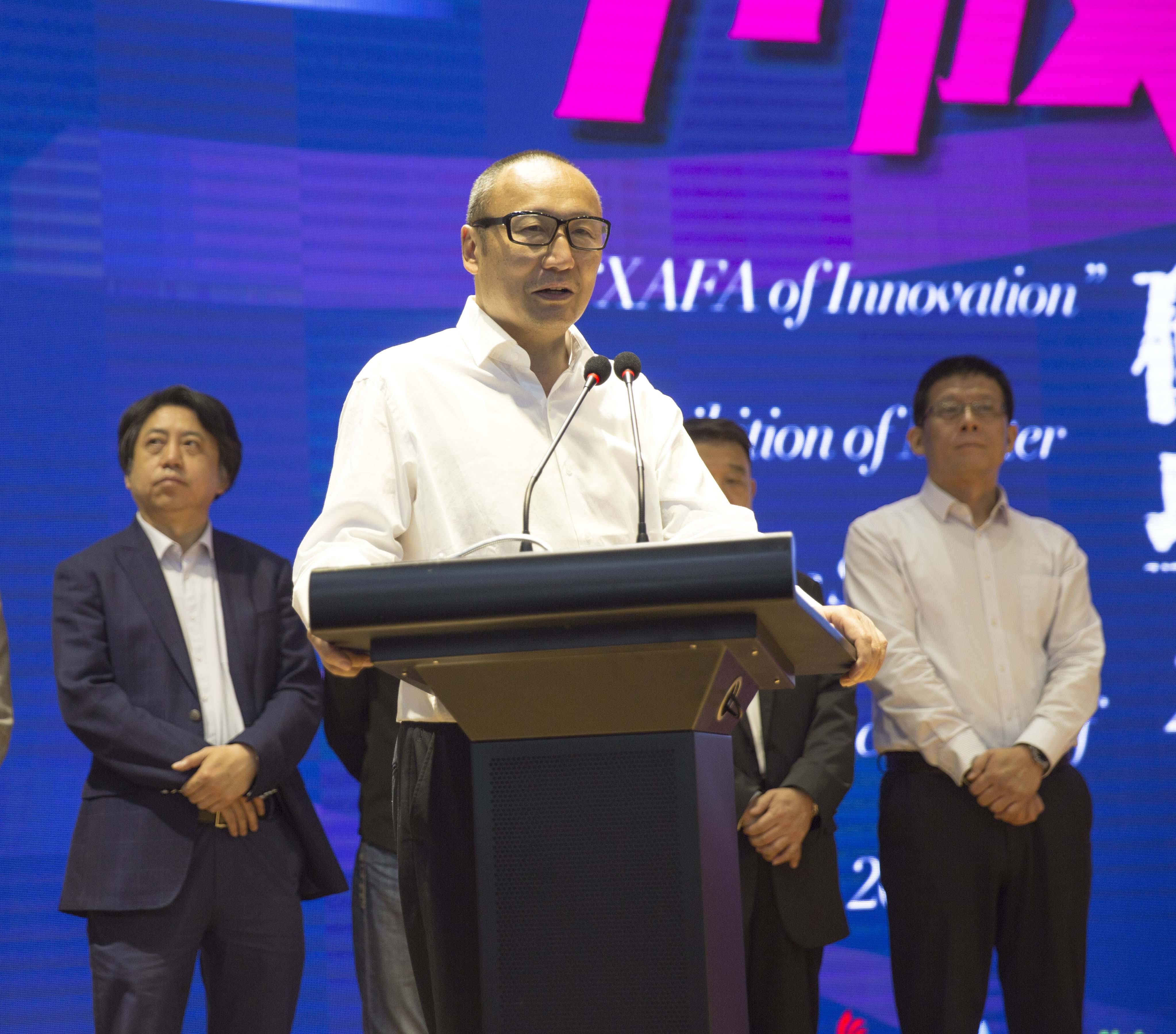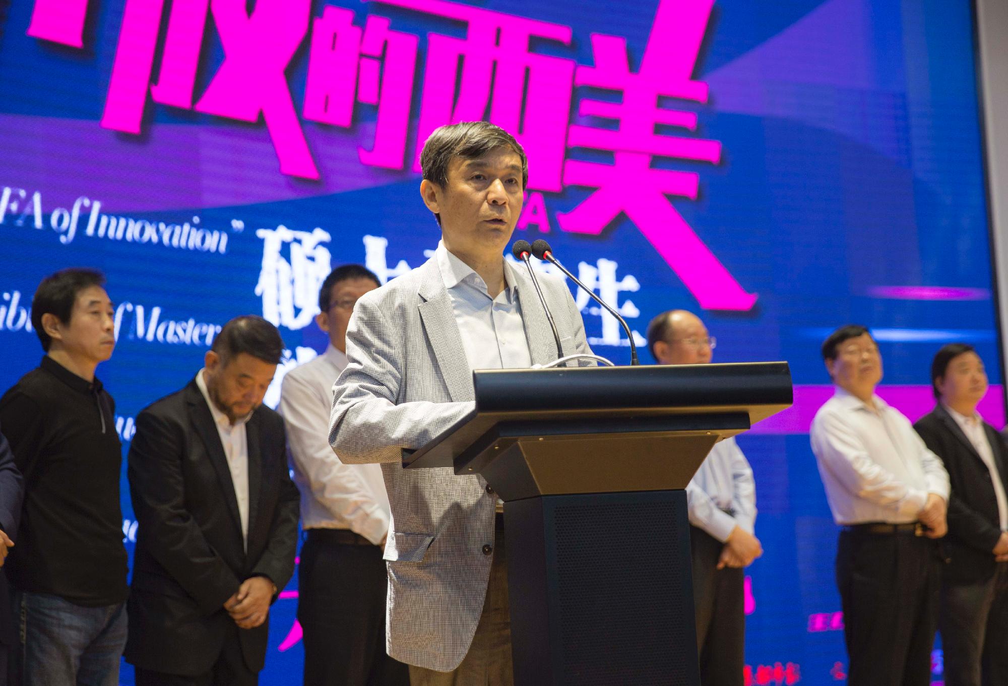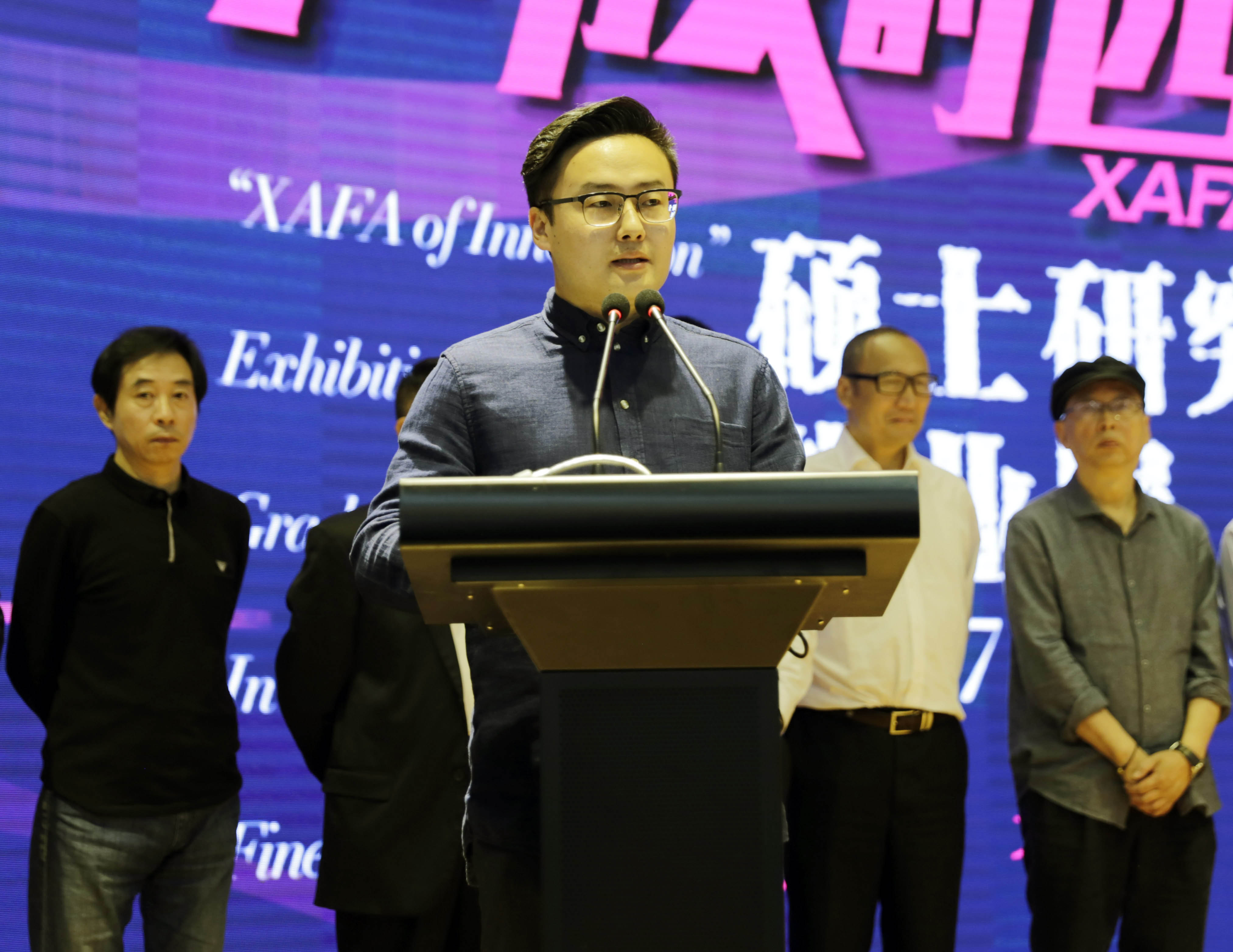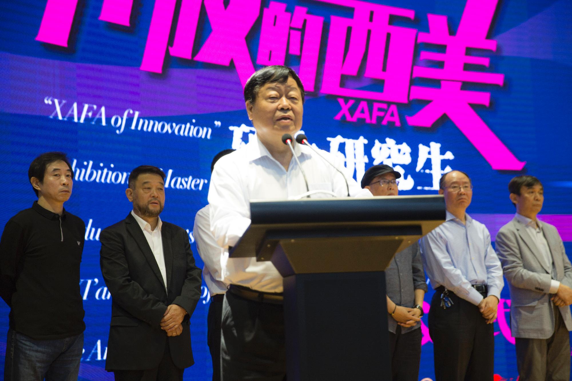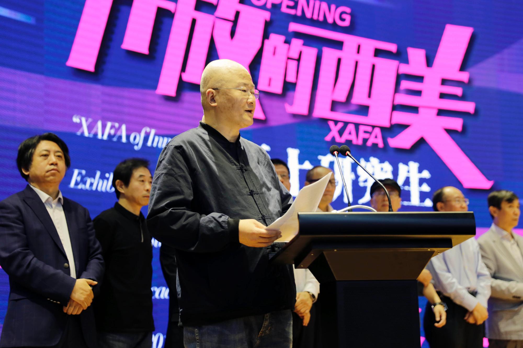 陕西省美术家协会主席王西京宣布“开放的西美——西安美术学院2017届硕士研究生毕业作品展”开幕。