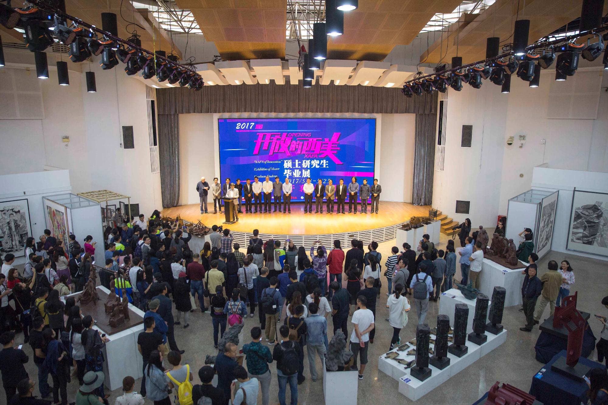 5月9日上午,“开放的西美”——西安美术学院2017届硕士研究生毕业作品展开幕式在西部美术馆隆重举行。陕西省美术家协会主席王西京、北京大学朱青生教授,四川美术学院王林教授,美术博物馆馆长罗宁,我院党委书记王家春,院长郭线庐,党委副书记赵万东,副院长贺荣敏、贺丹、李四军、宋晓峰,纪委书记李翔宇,党委委员、组织部部长杨孝龙,陕西省美协顾问胡明军,陕西师范大学美术学院副院长韦兵,天津美术学院李孝萱教授等嘉宾出席开幕式,学院各系处负责人、研究生导师代表和全体毕业研究生参加了开幕式。开幕式由副院长姜怡翔主持。