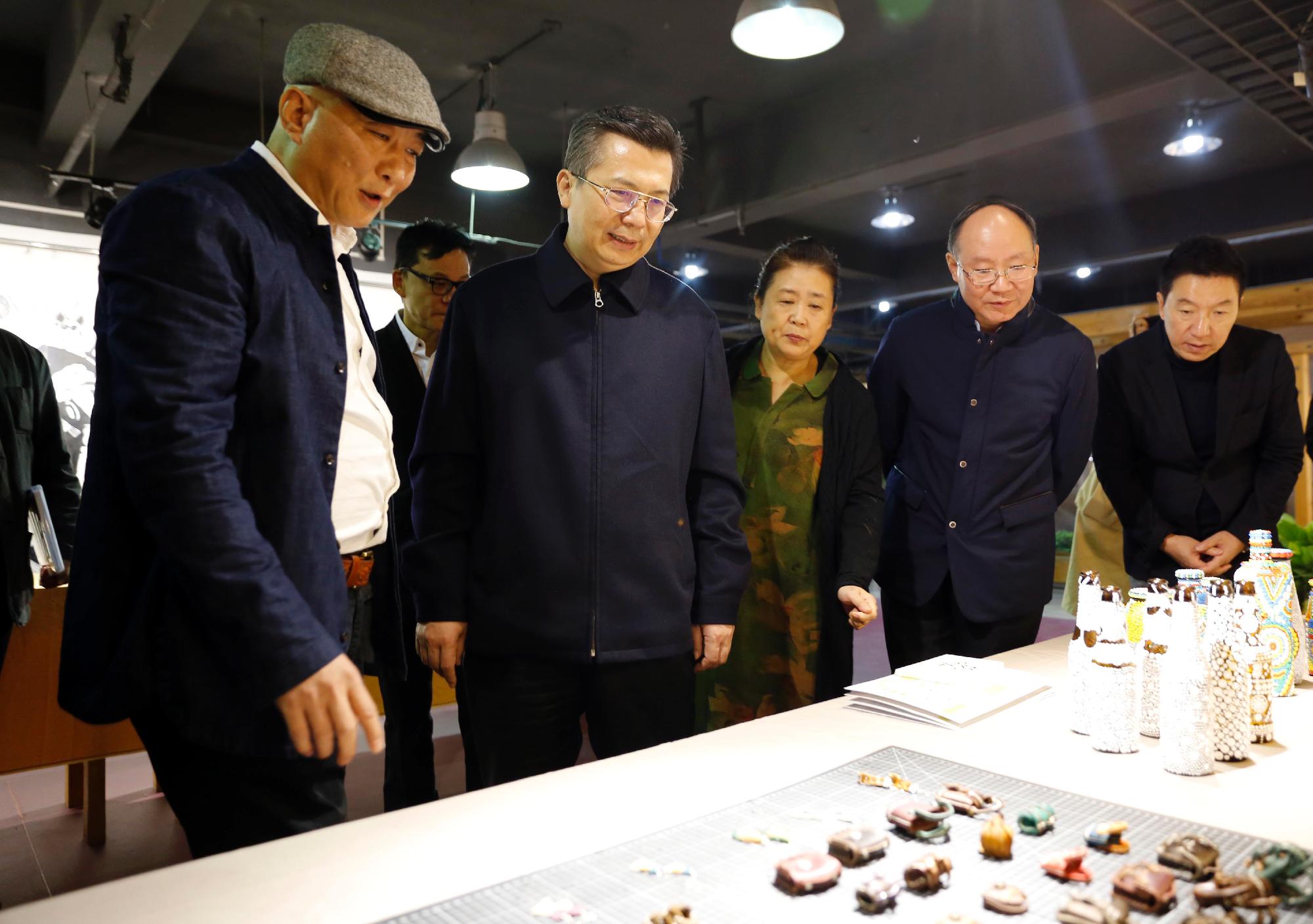 得知特殊教育学院听障学生的作品多次作为国礼走出国门,王永康勉励大家乐观面对生活、刻苦努力学习、潜心文艺创作,多挖掘西安优秀文化,把西安元素融入到创作中去,通过创作富有西安特色的作品,更好地宣传西安、展示西安,并希望学院和社会各界用心、用爱、用艺术的美关爱学生们成长成才。在版画系国家级教学实验室,王永康观赏版画作品,了解版画制作过程。看到国画系师生共同为西安创作的作品《盛世繁华》时,他说,这幅作品很有气势,希望广大师生创造出更多优秀作品,希望学院致力于培养更多高素质的新型国画人才。在文创教学中心的创业项目孵化平台——创客咖啡,王永康与创业大学生一一握手交谈并欣赏文创产品。得知创业者张茜为旅游景区、博物馆设计开发产品,现已研发上市500多款原创产品时,王永康竖起了大拇指。他说,要为西安美院创客咖啡点赞,为大学生创业团队点赞。他鼓励创业大学生要坚持远大理想,坚定创业信心,大力发展文创产品,做大做强文化创意产业,打造具有美院特色、西安名片式的文化创业品牌。