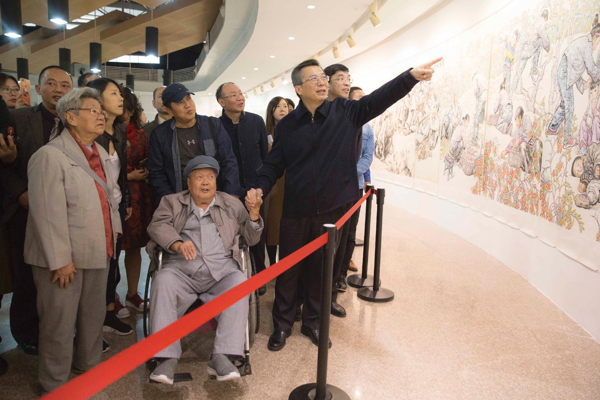 王永康首先来到美术馆,这里正在举行“心中有人民”——喜迎十九大刘文西百米长卷展。王永康说,一直期盼着来观看长卷展,这次终于见到这些宝贝了。展馆内,王永康搀扶着刘老,边走边看,他认真了解刘老的创作历程和每幅作品的时代背景。看到画作中生动的陕北老农、活泼顽皮的孩童、充满希望的秋收场景,王永康赞叹道:每一幅画都能让人驻足大半天,都非常生动,生活气息浓郁。这些作品都是咱的宝贝,是美术馆的精品。它向我们展现了陕北劳动人民昂扬向上的精神风貌,证明了只有深入生活、扎根人民,才能创作出无愧于时代、无愧于人民的艺术精品。