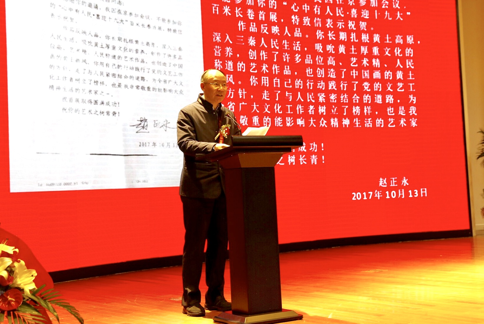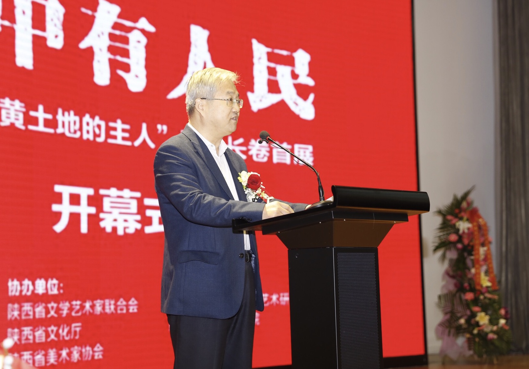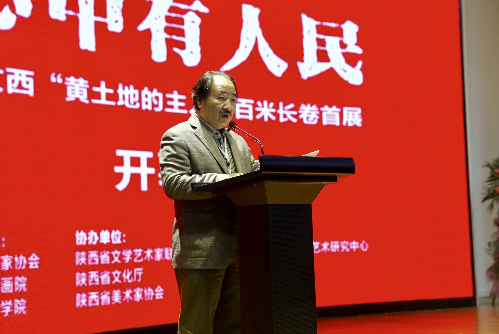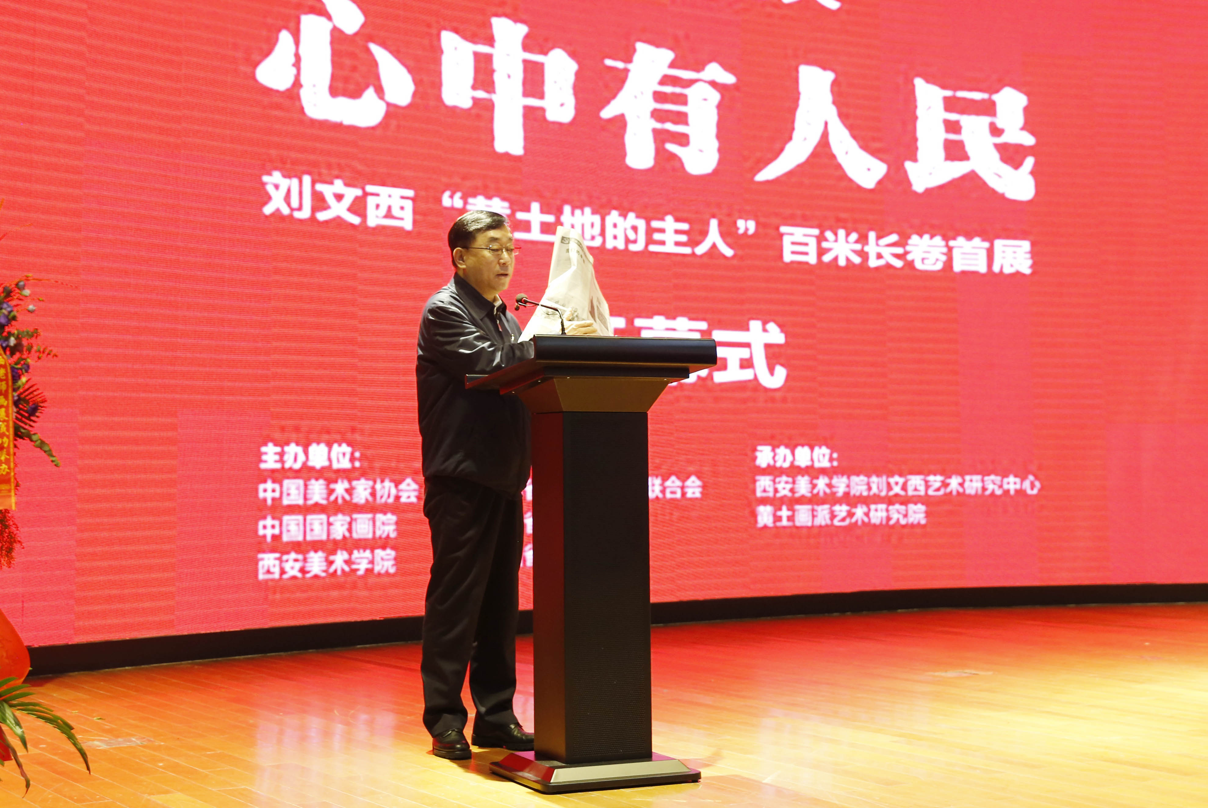 西安美术学院党委书记王家春致开幕词。他指出,西安美术学院建校六十八年以来,始终贯彻落实党的教育方针和文艺方针,坚持“以人民为中心”的创作导向和育人导向,在长期的办学实践中,孕育了在中国当代美术史上具有深远影响的黄土画派,推出了一大批为人民群众所喜爱的,传得开、留得下的精品力作,用坚实的艺术自信与文化自信诠释了艺术家的责任、使命和担当,此次展出的百米长卷《黄土地的主人》,是中国著名美术教育家、中国人物画大师、全国教学名师、西安美术学院名誉院长刘文西教授历时十三年创作的学术积淀与最新成果,是全景式反映改革开放以来陕北劳动人民精神面貌的时代画卷,也是西安美术学院贯彻落实习近平总书记文艺思想,向党的十九大胜利召开的汇报献礼。该作充分展现了刘文西先生笔下蕴含的中国特色、中国风格、中国气派和中华审美风范,更充分体现了他作为人民艺术家,不忘初心、继续前行的崇高艺术追求。