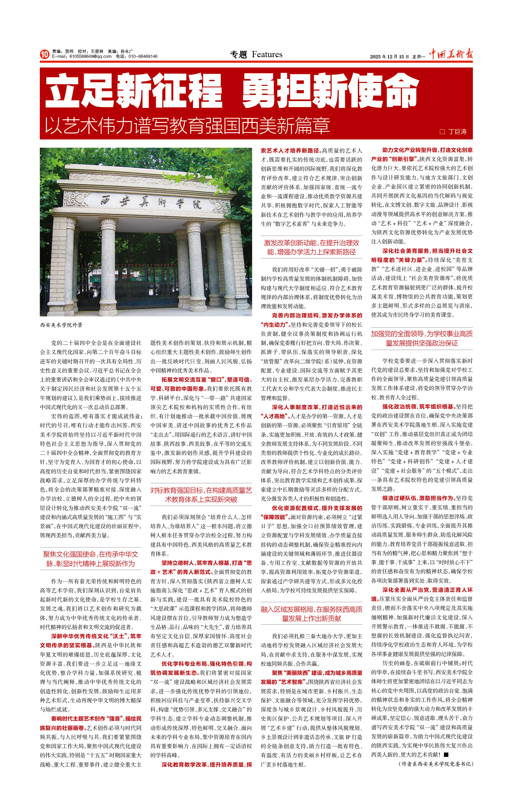 编者按:12月15日,西安美院党委书记丁巨涛在《中国美术报》发表题为《立足新征程 勇担新使命 以艺术伟力谱写教育强国西美新篇章》的署名文章。文章深入学习贯彻党的二十届四中全会精神,紧扣“为党育人、为国育才”的初心使命,立足高等艺术教育的时代方位与责任担当,系统阐述了西安美术学院在推进教育强国、文化强国建设中的战略思考与实践路径。充分展现了西安美术学院胸怀“国之大者”、心系“省之要事”的政治自觉与使命意识,彰显了以艺术之力服务中国式现代化的坚定决心。现全文转载。