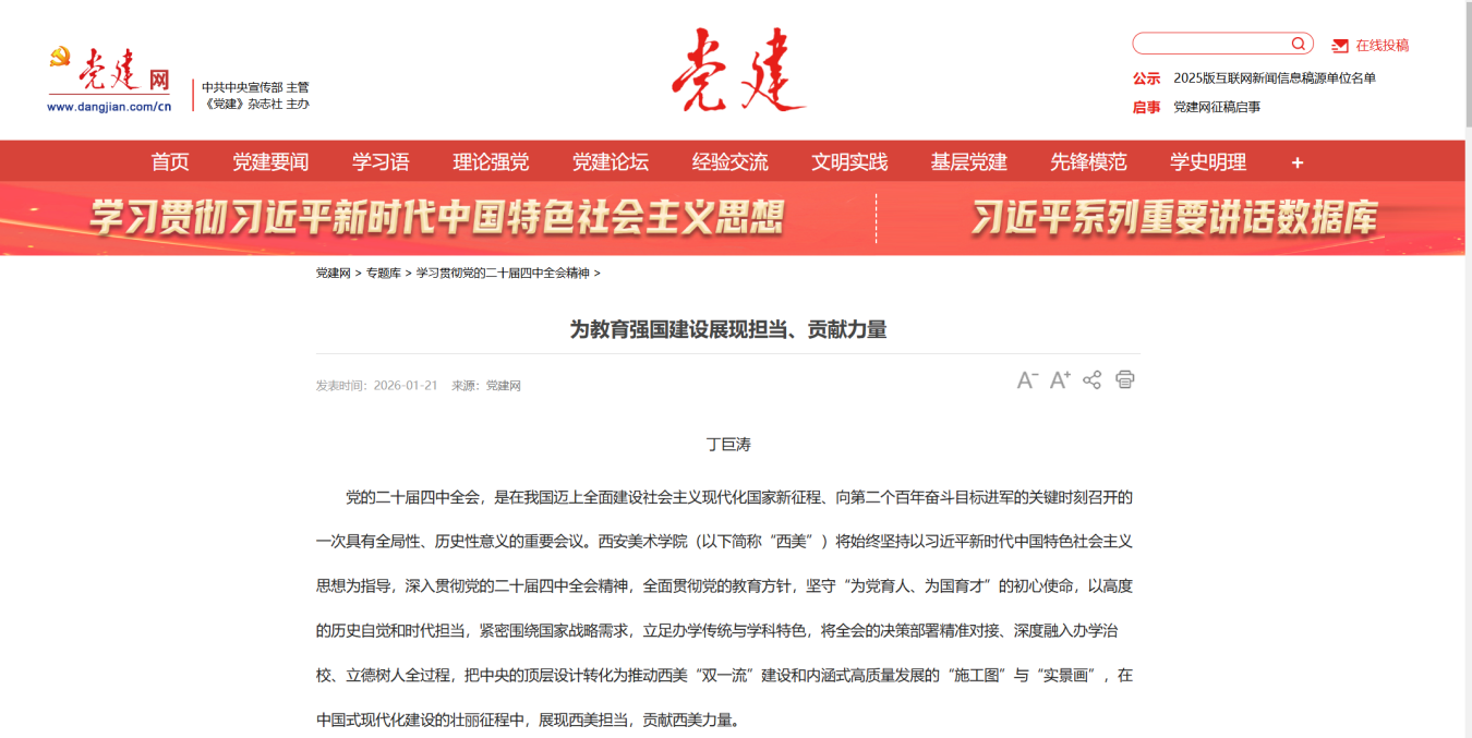 编者按:近日,西安美术学院党委书记丁巨涛在党建网发表署名文章《为教育强国建设展现担当、贡献力量》,深入学习贯彻党的二十届四中全会精神,系统阐述了西安美术学院如何立足新时代新征程,以高度的政治自觉和使命担当,将党中央决策部署转化为推动学校“双一流”建设和内涵式高质量发展的实际行动。文章从聚焦文化强国使命、对标教育强国目标、激发改革创新动能、融入区域发展格局、加强党的全面领导等五个维度,全面描绘了西安美术学院服务国家战略、扎根三秦大地、勇担育人使命的发展蓝图,充分彰显了艺术院校在推进中国式现代化进程中的责任与作为。现全文转载。