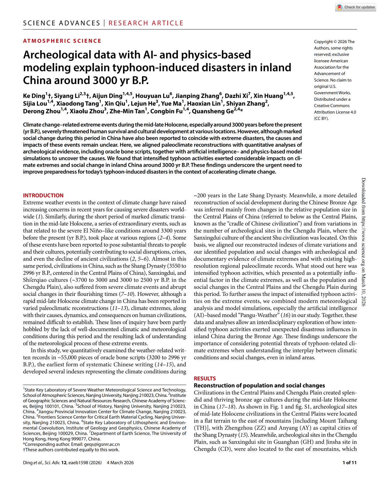 3月10日,国际权威综合类期刊《Science Advances》发表了一篇题为《Archeological data with AI- and physics-based modeling explain typhoon-induced disasters in inland China around 3000 yr B.P.》(《基于考古数据结合人工智能与物理模型揭示约3000年前中国内陆台风的致灾机制》)的文章。我校周晓陆教授作为第三作者,为该文的研究工作提供了重要助力,并作为共同作者参与撰写。