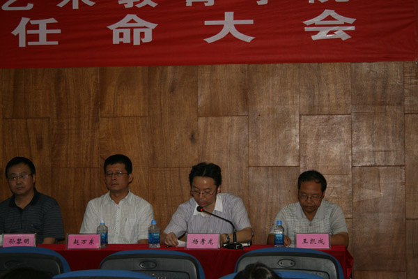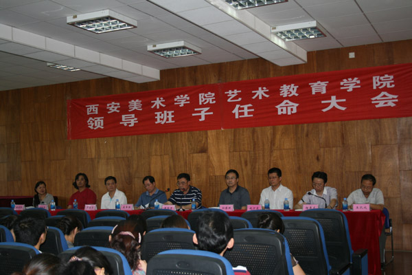 7月9日下午,西安美术学院党委在临潼校区音乐学术厅召开艺术教育学院干部任命大会。西安美术学院党委任命杨孝龙为艺术教育学院党总支书记、省小学教师培训中心主任(正处), 宋晓峰为艺术教育学院院长(正处),陈亚琴为艺术教育学院党总支副书记(副处), 王凯成为艺术教育学院副院长、省小学教师培训中心副主任(副处),王继安为西安美术学院党委组织部正处级组织员。西安美术学院党委书记朱恪孝、纪委书记孙黎明、组织部长史军强、党办主任赵万东、临潼校区全体教职员工参加了大会。