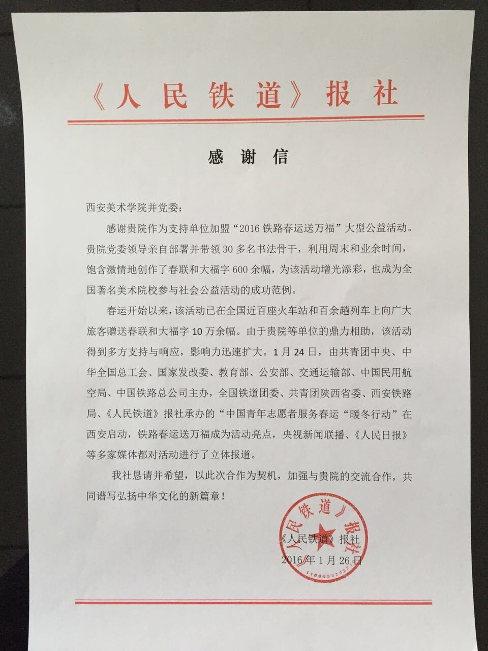 1月26日,《人民铁道》报社向西安美术学院发来感谢信,感谢西安美术学院作为支持单位加盟“2016铁路春运送万福”大型公益活动。感谢信指出,在我院党委领导亲自部署和带领下,30多名艺术家利用周末和业余时间,饱含激情地创作了春联和大福字600余幅,为"2016铁路春运送万福"大型公益活动增光添彩,也成为全国著名美术院校参与社会公益活动的成功范例。感谢信指出,由于我院以及相关单位的鼎力相助,该活动得到多方支持与响应,影响力迅速扩大。1月24日,由共青团中央、中华全国总工会、国家发改委、教育部、公安部、交通运输部、中国民用航空局、中国铁路总公司主办,全国铁道团委、共青团陕西省委、西安铁路局、《人民铁道》报社承办的“中国青年志愿者服务春运“暖冬行动”在西安启动,铁路春运送万福成为活动亮点,央视新闻联播、《人民日报》等多家媒体都对活动进行了立体报道。