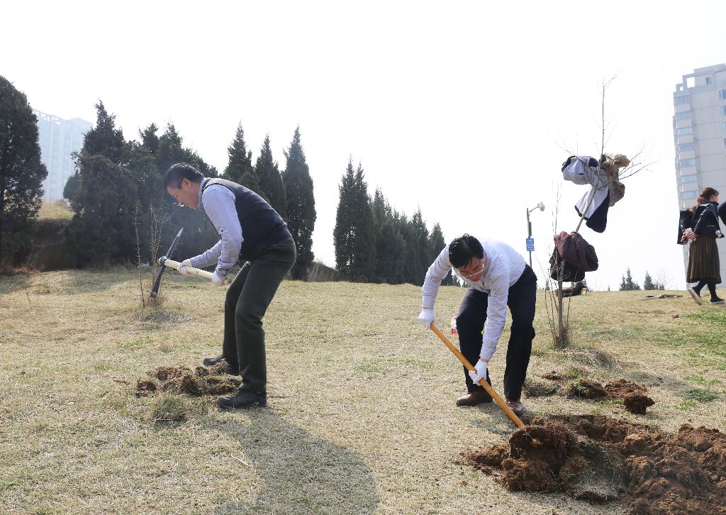 植树现场,从学院领导到干部职工都热情高涨,干劲十足,挥动着手中的锄头、铁锨。大家互相配合,有的栽种树苗、有的培土,呈现出一派热火朝天的景象。经过两个多小时的紧张劳动,200余棵树苗扎根在校园中,展现出一幅生机盎然的景象。