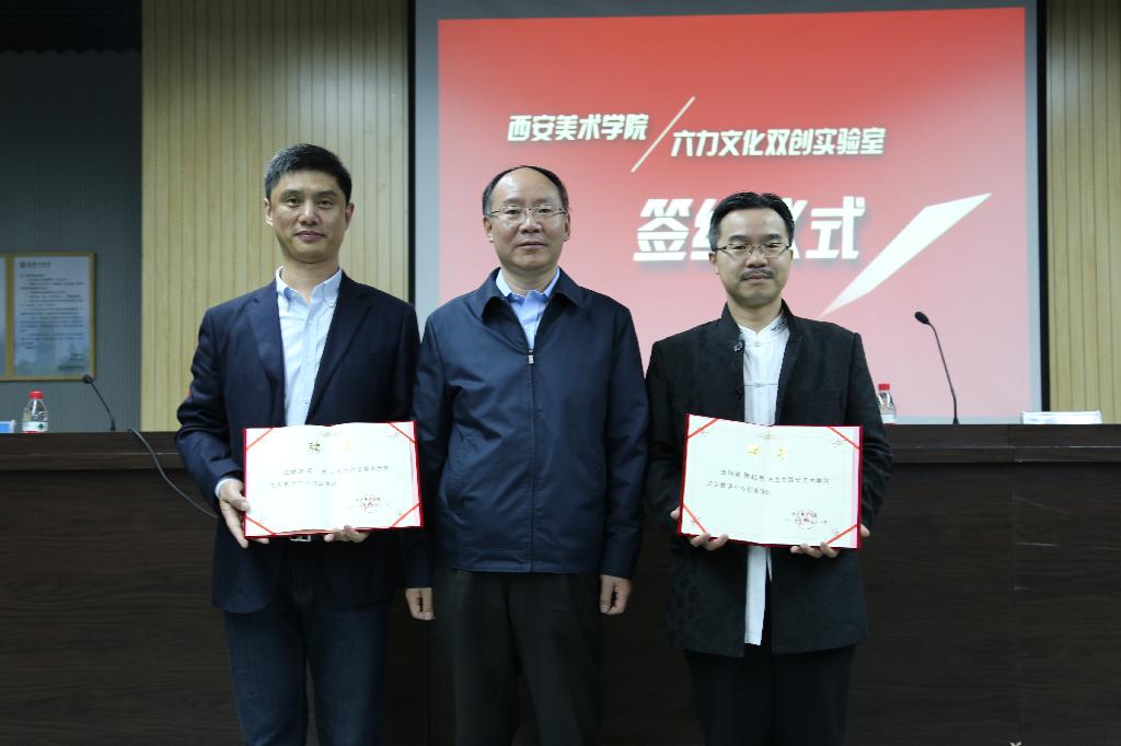 仪式上,王家春为张继明、司杰颁发西安美术学院文创教学中心创业导师聘书,李四军代表学院与六力文化签署合作协议并为西安美院六力文化双创实验室揭牌。