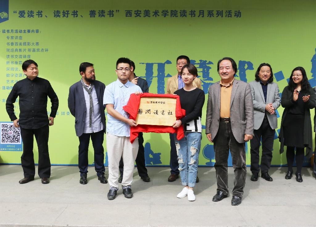 4月21日上午,西安美术学院读书月活动开幕式在笃行楼一楼圆厅举行。院党委书记王家春,副书记赵万东,副院长韩宝生、贺荣敏、贺丹出席开幕式。韩宝生介绍了读书月活动的主要内容和意义,对图书馆馆藏资源、读书月举办的一些列活动做了介绍。 贺荣敏为“图润读书社”揭牌。赵万东宣读“深阅读微书评”活动获奖学生名单与优秀组织者名单。与会嘉宾为获奖学生颁奖,王家春与贺丹为优秀组织者颁奖。教师与学生代表分别分享了读书感悟以及自我提升的方式。
