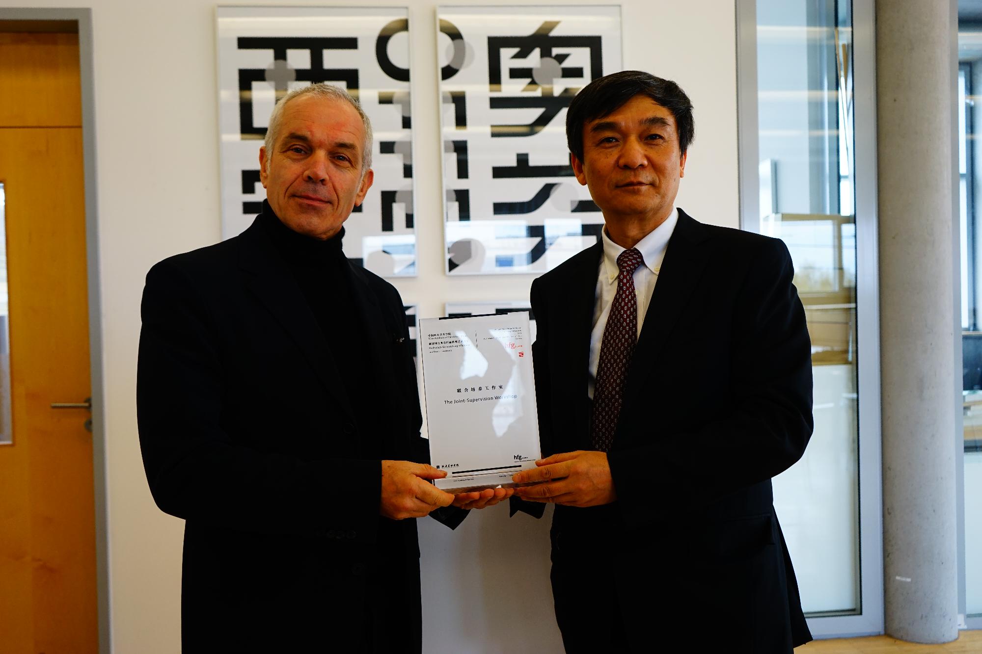 郭线庐院长和克劳斯·海瑟院长分别代表西安美术学院和奥芬巴赫造型艺术大学签署了两校的研究生联合培养工作室协议,并参加了双方联合培养工作室的挂牌仪式