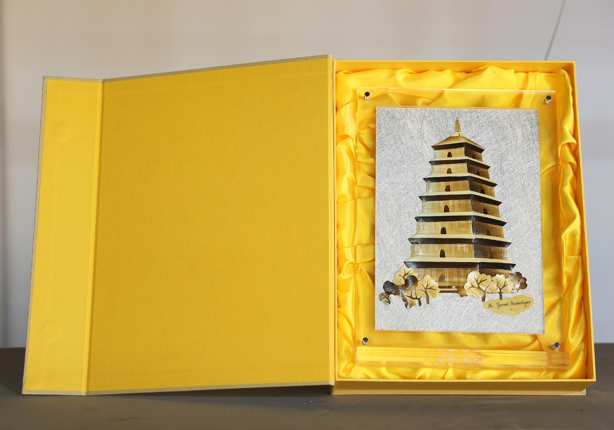 此次作为G20农业部长会议赠送给参会的各国农业部长与参会代表的国礼是麦秆画作品《大雁塔》和《跪射俑》,此作品由西安美术学院特殊教育艺术学院的师生,与全国劳模、工艺美术大师、中国非物质文化遗产传承人贺兴文携手共创而成。