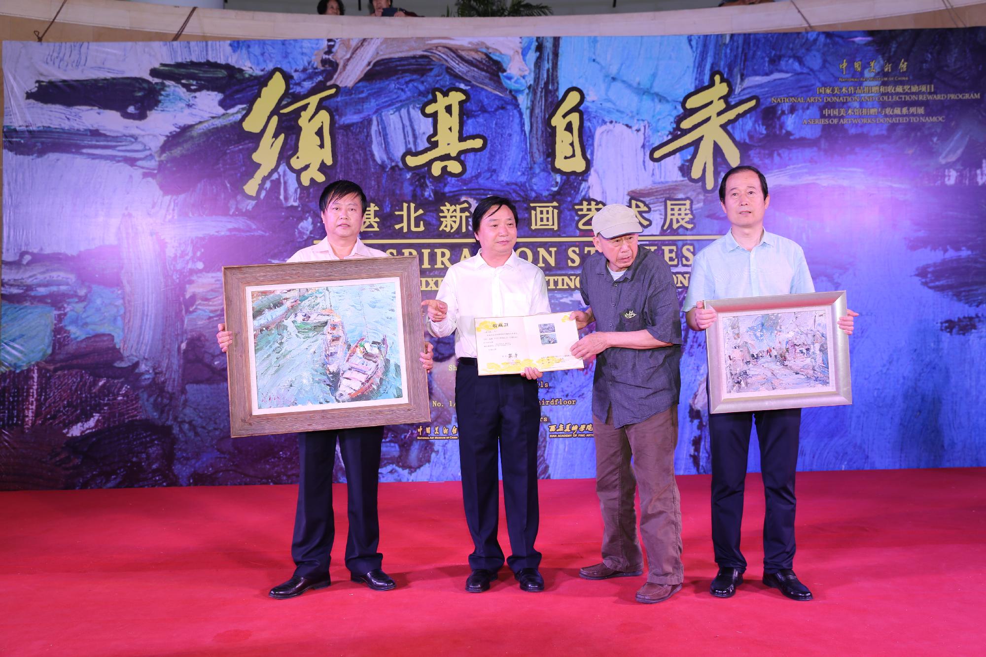 谌北新先生在讲话中对多年来关心自己及家人领导、同学、同事等表示感谢,为本次展览做了大量前期准备工作的朋友们表示感谢,对莅临展览的各界人士表示感谢。谌北新向陕西省美术博物馆捐赠《摆渡船》、《村口》两幅作品。
