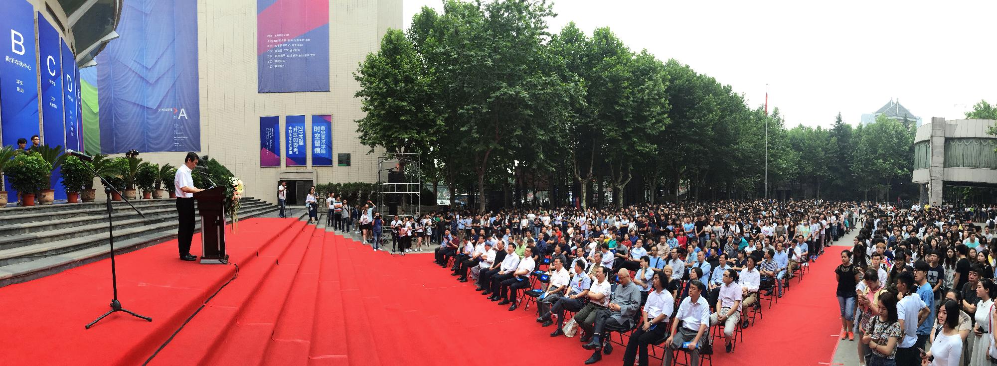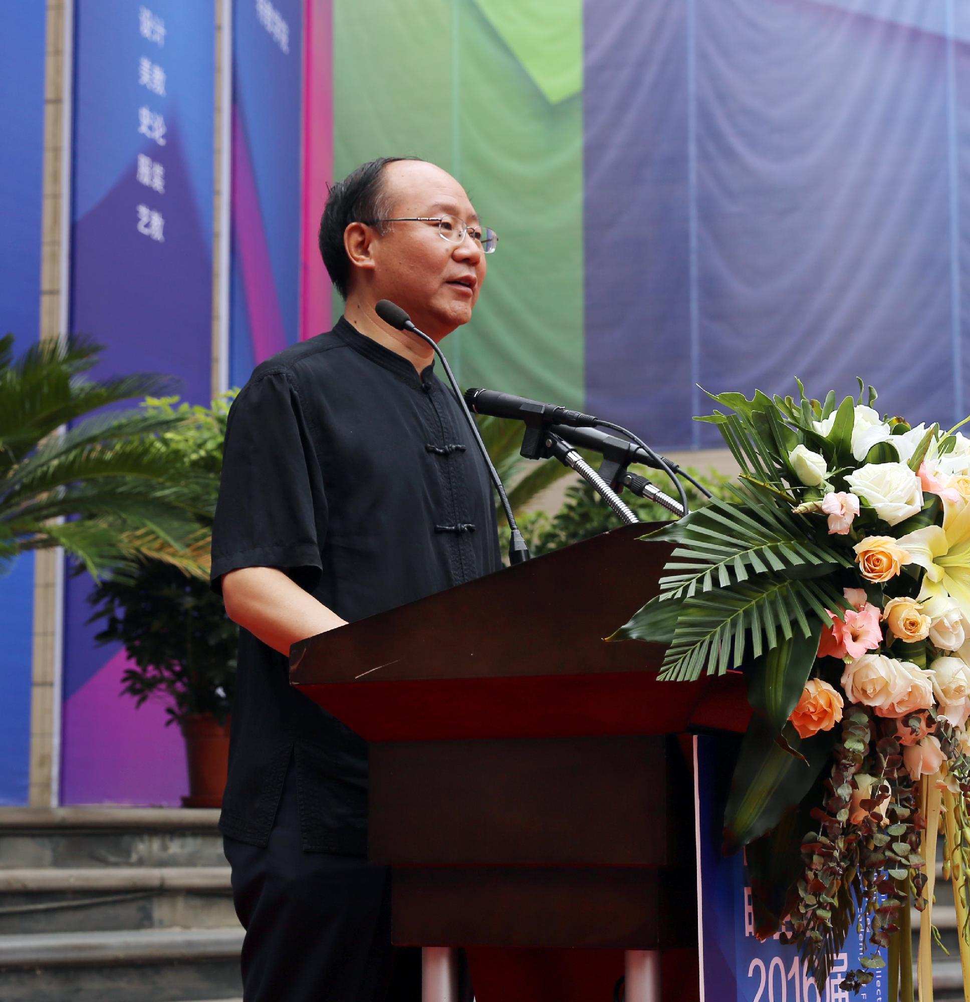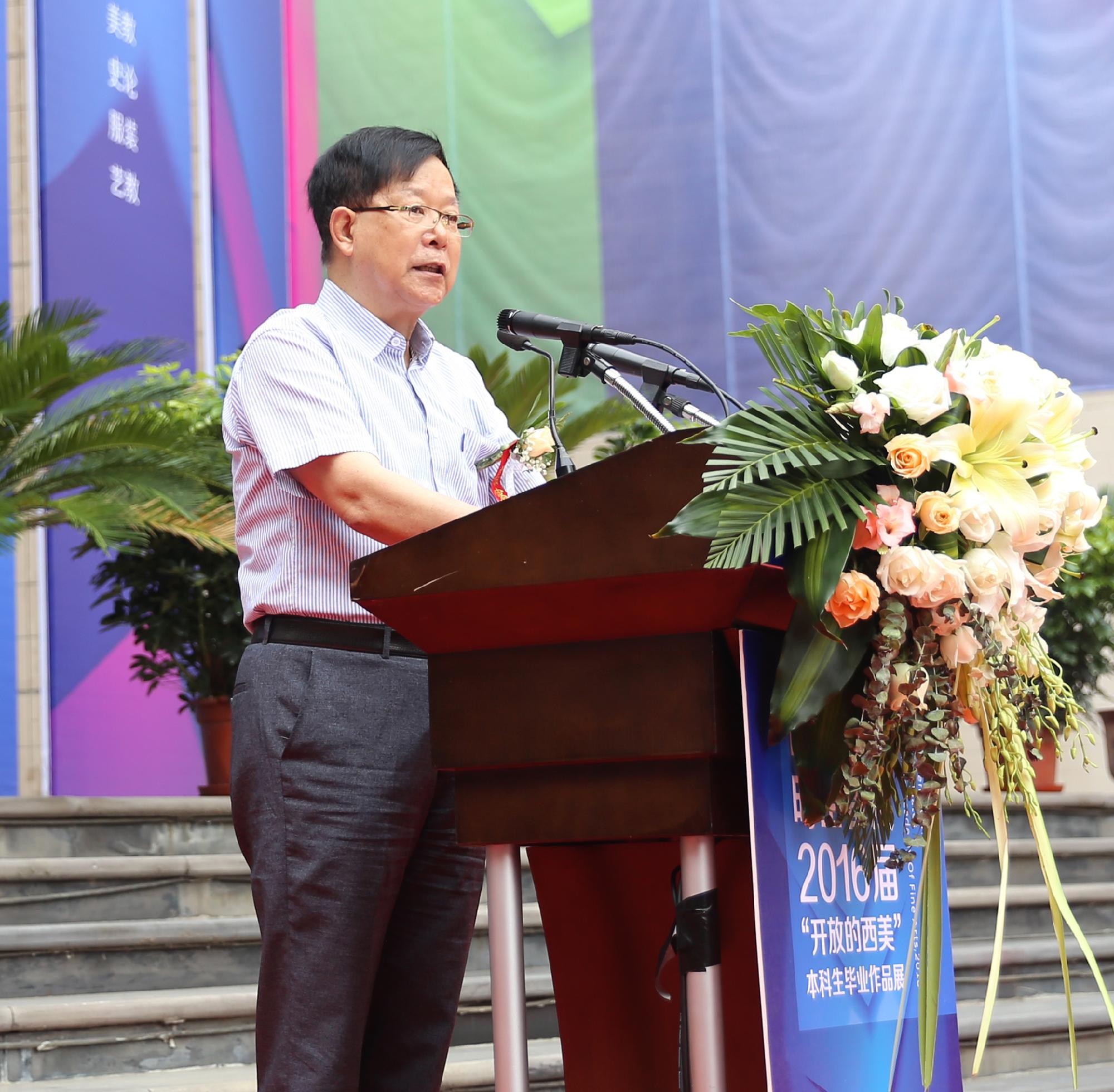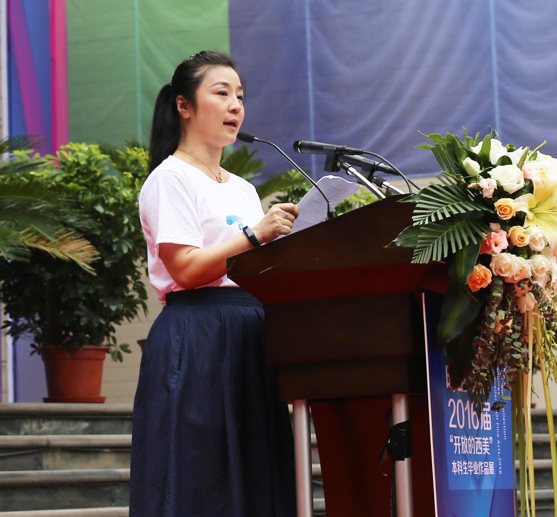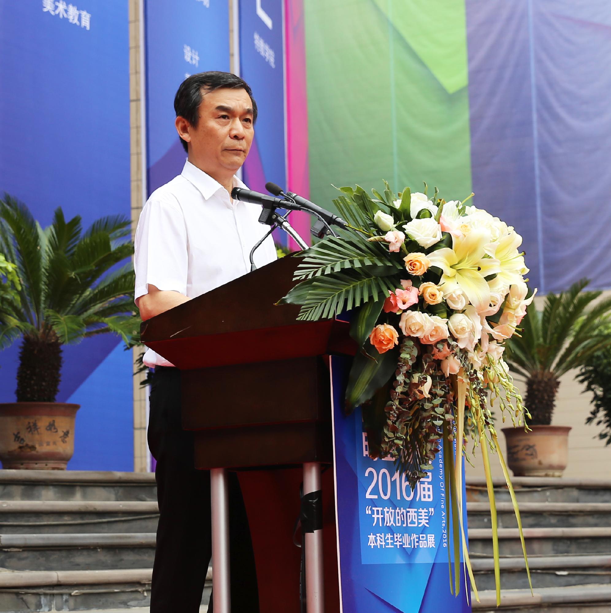 西安美术学院院长郭线庐致辞。郭线庐指出本次毕业展以“开放的西美”为主题,面向社会举办毕业生作品展,是西安美院主动适应高等教育改革发展新常态,自觉推送文化艺术繁荣发展,积极引领社会风尚、传承创新文化,努力为国家培养高层次优秀艺术人才的有益探索,是“出作品、出人才”培养成过的具体体现,也是对学院办学特色、办学优势、专业教学成果的集中推广和宣传。郭线庐希望本次毕业季活动,能够搭建起更有效的学院与社会交流平台,汇集更多人的智慧,共同探讨艺术教育创新发展的新思路、新举措。郭线庐向毕业生发出了“把青春时光留在西美”“把成长印记留在西美”热情感言。