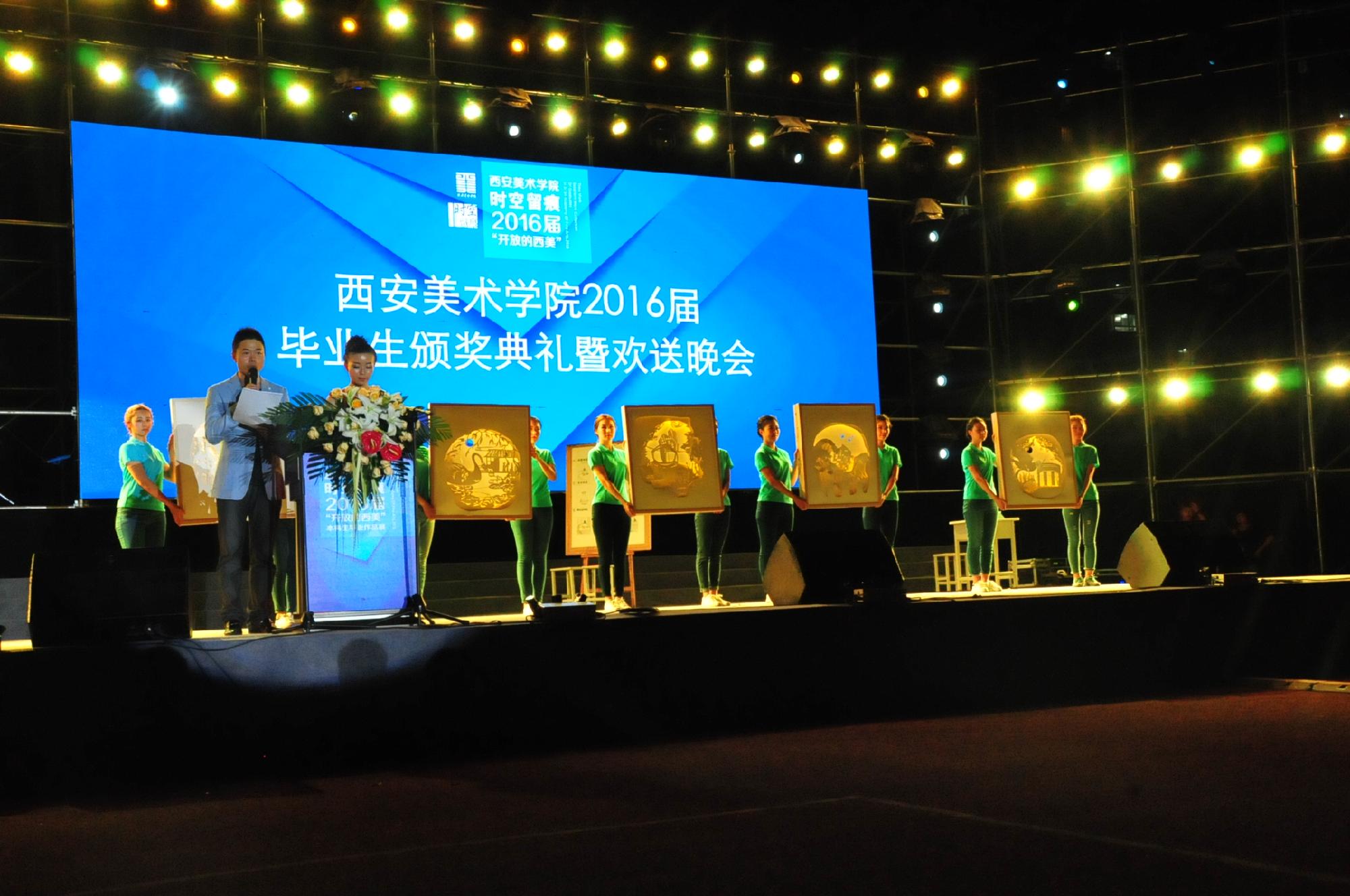 在颁奖过程中进行了2016届毕业生欢送晚会,动感活力的健美操表演引爆晚会现场,青年歌唱家杜鹏鹏演唱的陕北民歌高亢激昂,大学生艺术团的街舞展示了大学生良好的精神风貌,中国风舞蹈《佳人如梦》诠释了传统的美。影视动画系2016届学生毕业创作《梦回大雁塔》运用全立体3D建筑等比例投影技术,让原本古老而充满历史的建筑重新焕发活力,同时给观众以全方位新奇的视觉饕餮盛筵,引来阵阵掌声。诗朗诵《初夏的西美》表达了同学们告别母校的依依不舍和对大学四年生活的回忆。在2016届毕业生献礼环节中,同学们用中国传统的纸雕工艺,让母校的形象在刻刀下跃然纸上,伴着灯光煜煜生辉。毕业生欢送晚会在水鼓舞《明天会更好》中落下帷幕,整场晚会充满了毕业生对母校深深的眷恋,充满了对未来美好的向往,也充满了各自彼此真挚的祝福。