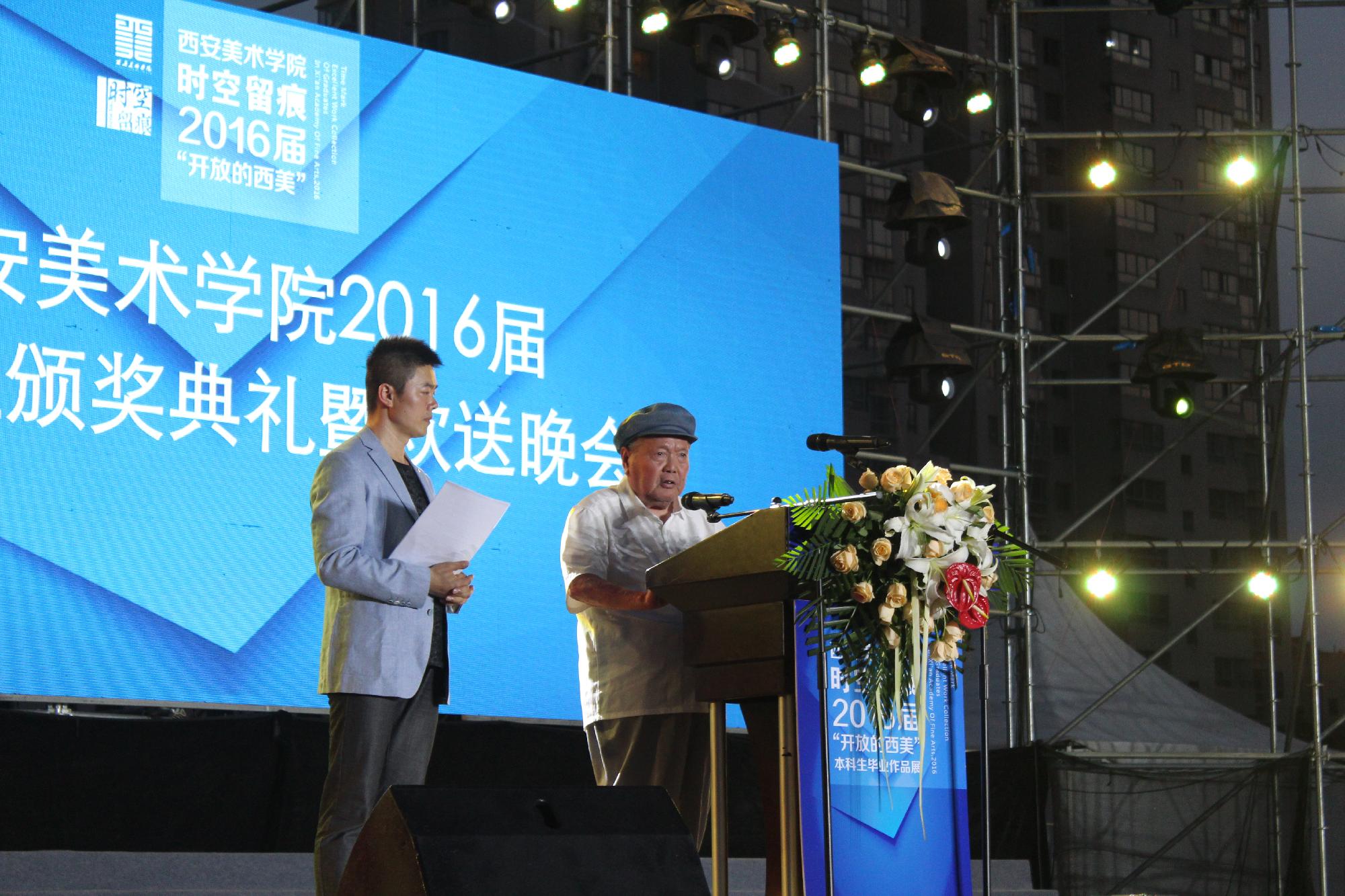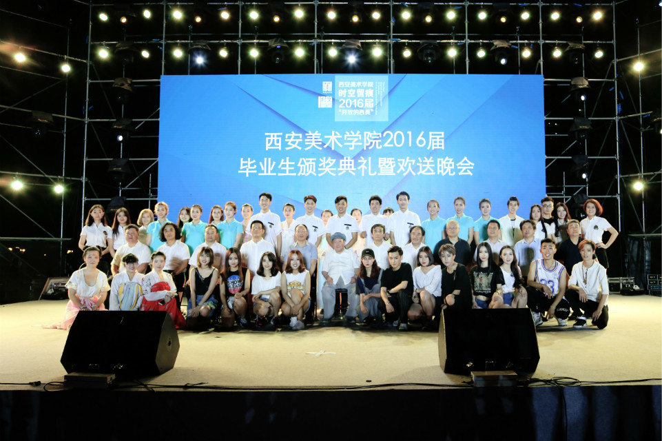 6月20日晚,我院2016届毕业生颁奖典礼暨欢送晚会在风雨操场举行。院党委书记王家春,院长郭线庐,名誉院长刘文西,党委副书记赵万东,副院长韩宝生、贺荣敏、贺丹、姜怡翔、李四军、宋晓峰,纪委书记李翔宇,总会计师王楚秦,院长助理李敏出席颁奖典礼。柯罗默当代艺术基金会主席柯罗默伯爵、伯爵夫人胡澄宇女士、柯罗默伯爵奖学金评审委员会委员凯伦•史密斯、西安美术馆馆长杨超、中国宣纸集团股份有限公司总经理朱大国、上海实业马利画材有限公司副总经理徐文富等嘉宾与我院各系处领导,2016届毕业生1500余人参加了晚会。