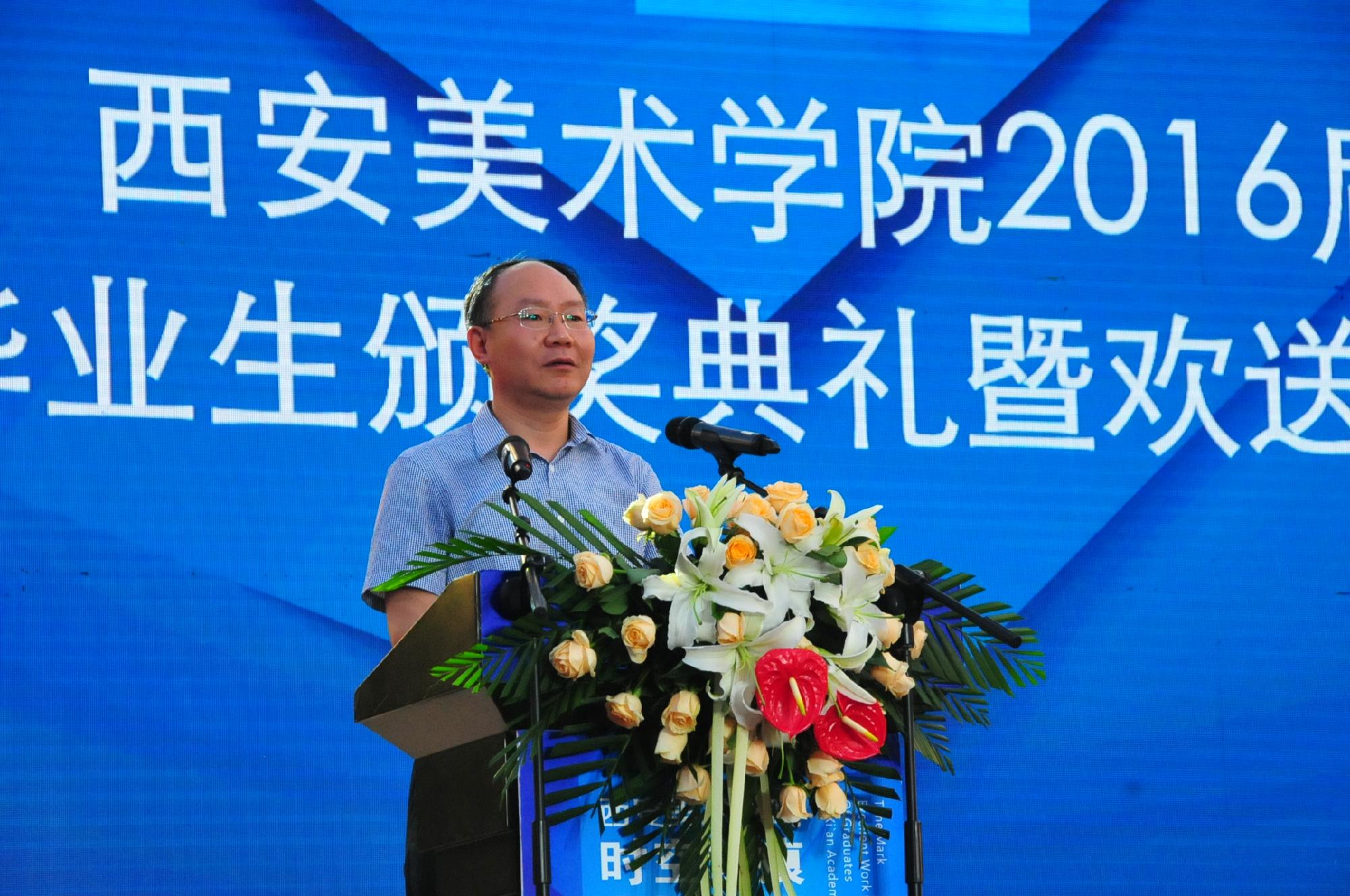 王家春做了题为《我骄傲,我们都是西美人》的亲切致辞,为获奖同学鼓掌,为毕业生们喝彩。王书记希望2016届毕业生牢记西安美院悠久的历史,学习石鲁、赵望云、何海霞、王子云、刘蒙天、刘文西、王子武这些优秀艺术家的艺术精神,内化为前进的动力。把对艺术和生活的热爱,把对社会和人民的担当永远镌刻在内心深处。毕业后无论走到哪里,“我是西美人”这一印记将永远与母校相连。王书记希望广大毕业生要敢于面对困难,经历磨难才会显现出艺术的灵气。要用艺术的修养,加快前行的步伐,用艺术的技巧,指导前行的当下,只有珍惜当下,才能扬帆起航。王书记希望毕业生们在未来的道路上,坚持与运动和读书交朋友,与大爱和慈悲做知己,为母校争光添彩,为社会做出贡献。最后,王书记与现场的2016届全体毕业生一起喊出了“我骄傲,我们都是西美人”。