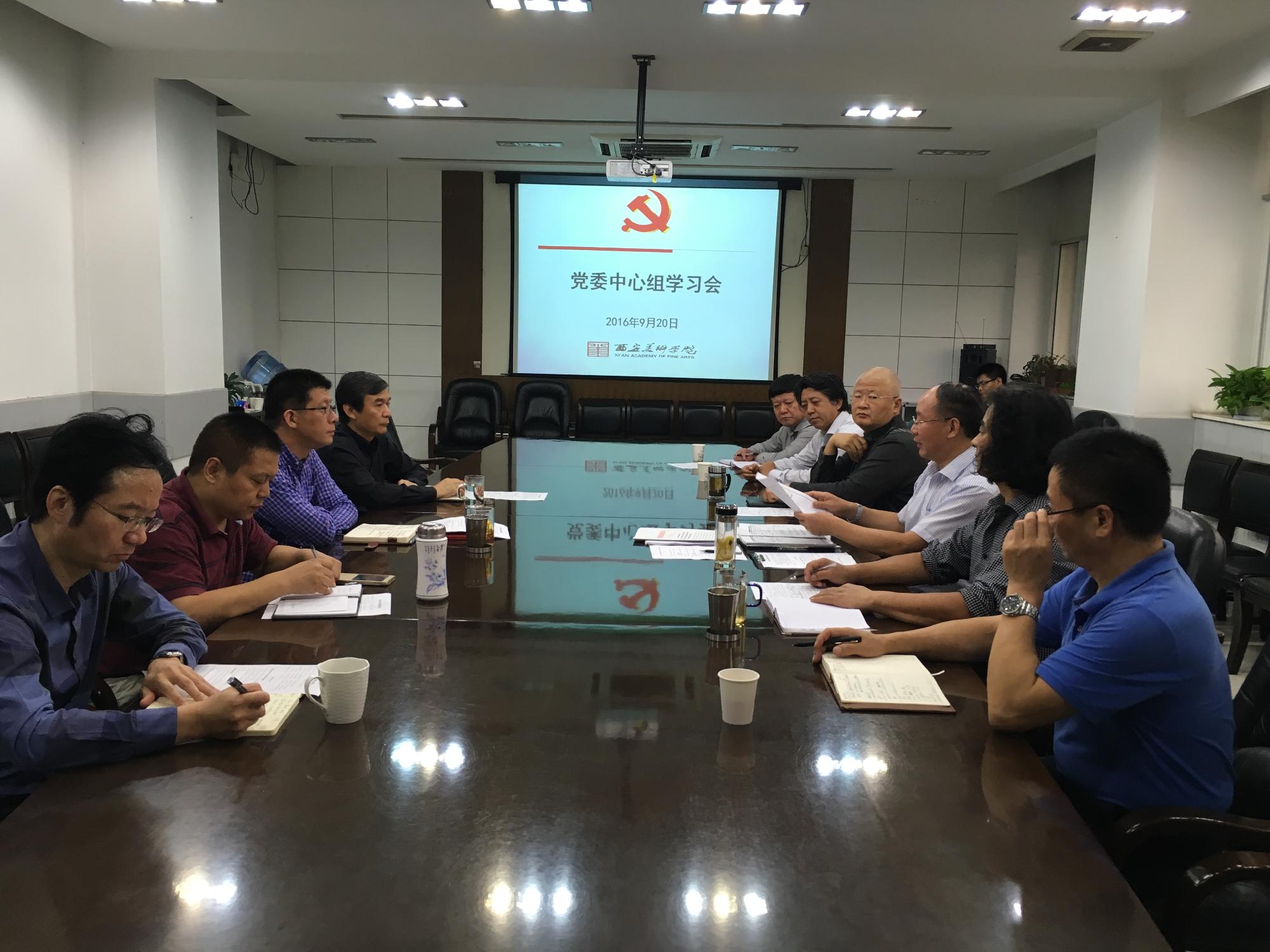 9月20日下午,院党委在笃行楼四楼会议室召开本学期第一次中心组学习会,会议传达学习了中央、省委有关贯彻习近平总书记“七·一”重要讲话精神,深入推进“两学一做”学习教育、干部队伍建设、党风廉政建设,落实“三项机制”等文件精神。院党委书记王家春主持会议,并对进一步加强党委班子建设提出新的要求和希望。党委副书记、院长郭线庐,党委副书记赵万东,党委委员、副院长姜怡翔、李四军、宋晓峰,纪委书记李翔宇,总会计师王楚秦,组织部部长杨孝龙等全体党委班子成员参加会议。