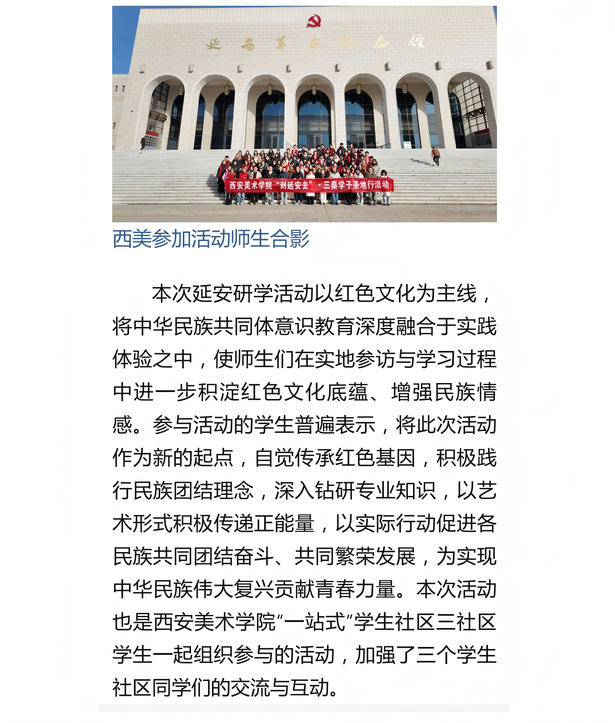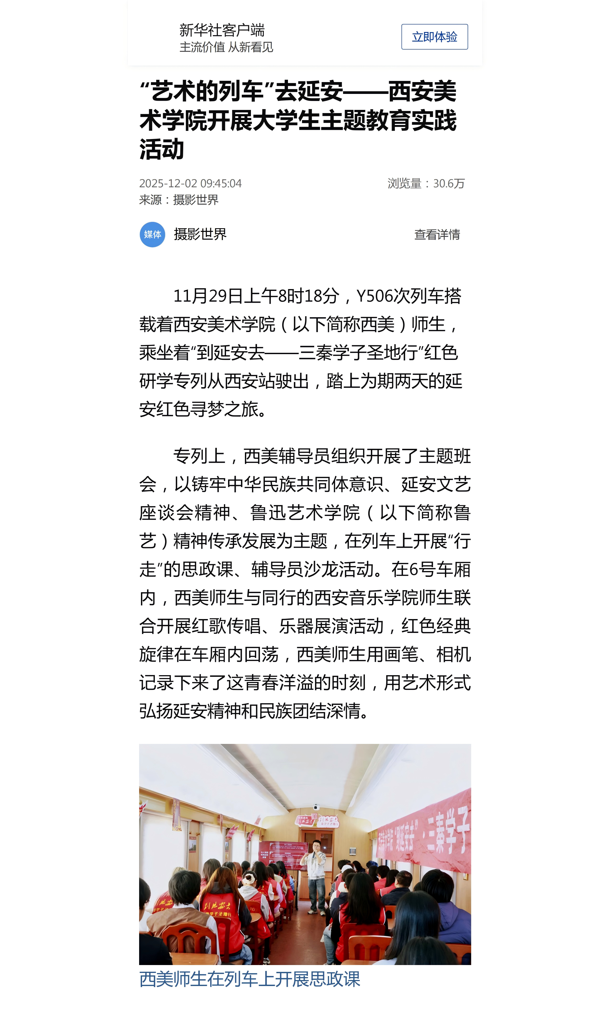 12月2日,新华社报道西安美院师生乘坐“到延安去——三秦学子圣地行”红色研学专列,踏上延安红色寻梦之旅,感悟先辈奋斗历程,汲取青春奋进力量。通过实地探访、艺术创作等形式,让青年学子在红色文化的熏陶中深化对党的历史的理解和认同。西安美院的师生们带着对艺术的热爱和对革命先辈的崇敬,一路前行,用画笔和镜头记录下延安的红色印记,将红色基因融入艺术创作之中。具体报道内容如下: