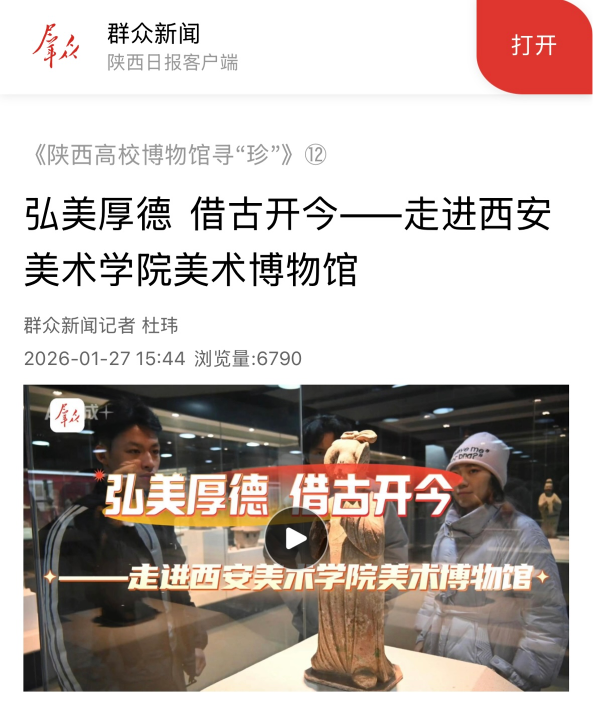 编者按:1月27日,《群众新闻》刊发《陕西高校博物馆寻“珍”》系列之《弘美厚德 借古开今——走进西安美术学院美术博物馆》专题文章,全景呈现了我校美术博物馆在藏品保护、教学融合、社会美育与数字创新等方面的生动实践与显著成效。作为一所扎根西部、融通古今的高校专业博物馆,西安美院美术博物馆不仅珍藏着2万余件涵盖古代绘画、历代文物、现当代艺术与西北民间美术的珍贵藏品,更将“弘美厚德、借古开今”的校训精神贯穿于展陈设计、课程建设与公共文化服务之中,美术博物馆正以高度的文化自觉与教育担当,打造集收藏、研究、教学、美育于一体的无界式“艺术课堂”,在传承中华优秀传统文化、服务新时代美育事业中迈出坚实步伐,做出独特贡献。具体报道内容如下: