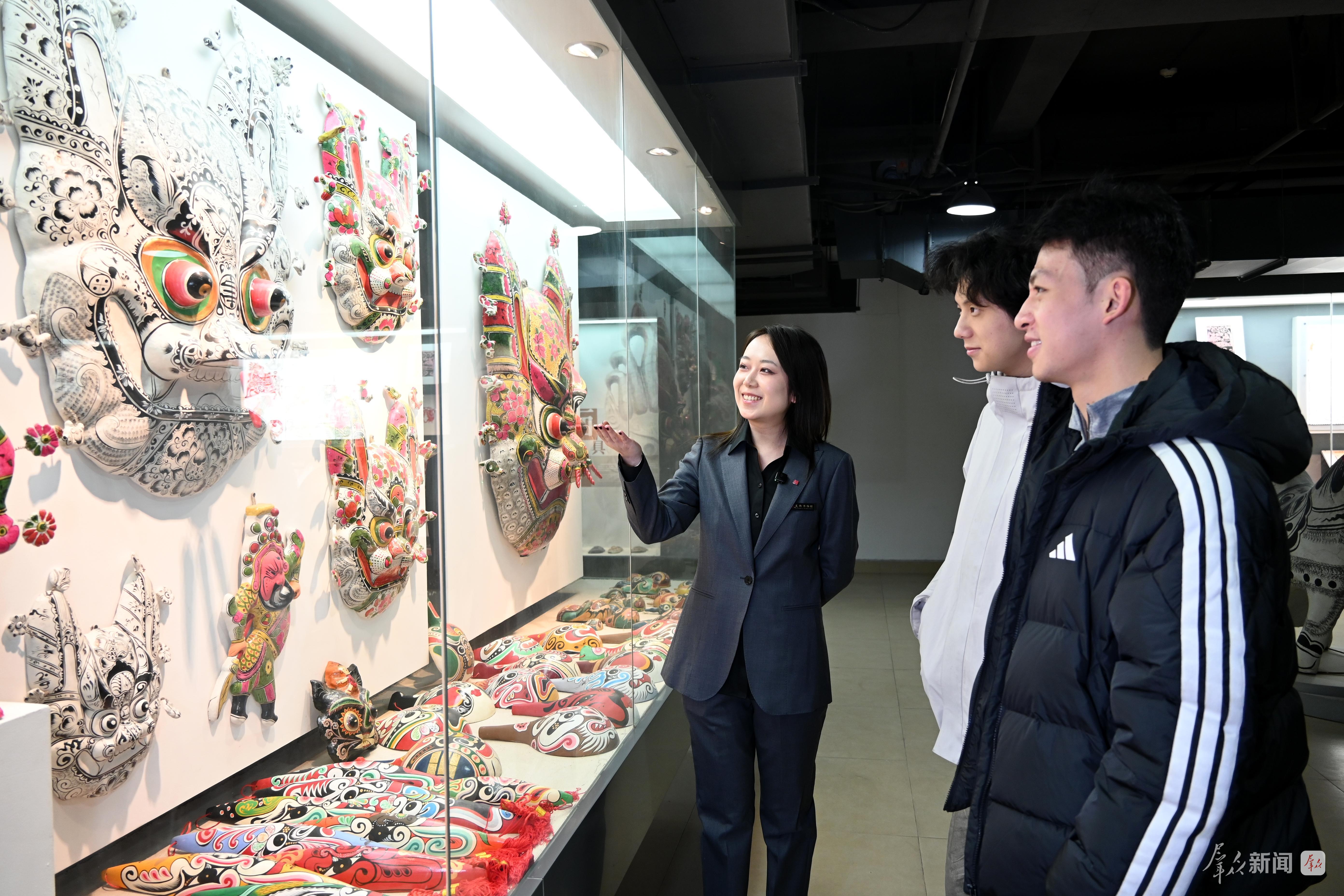 在西安美术学院美术博物馆的民间美术馆,讲解人员在给参观者讲解剪纸、泥塑、面具等民间艺术形式