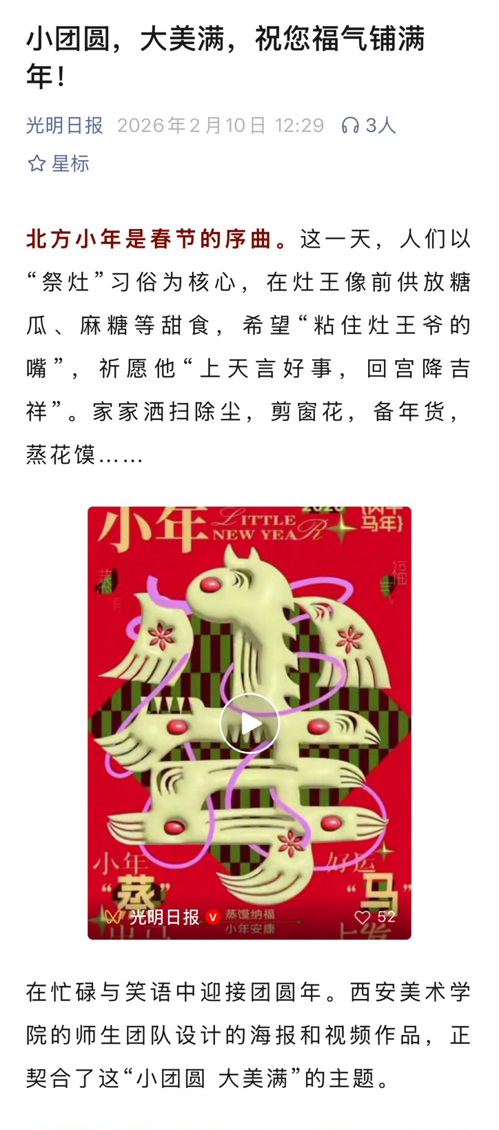 编者按:2月10日,值此北方小年之际,《光明日报》联合西安美术学院推出“小团圆,大美满”主题视觉创作,由我校设计艺术学院师生团队以当代设计语言激活传统年俗。作品巧妙融合糖瓜、灶马、剪纸、凤翔年画、关中土布及唐代金银器等陕西非遗与地域元素,通过《灶福临门》《马上有“馍”》《大唐鸿福》等系列海报,既传承“祭灶祈福”的民间信仰,又以几何构成、鲜明色彩与趣味形象实现传统文化的年轻化表达,彰显高校艺术力量在推动中华优秀传统文化创造性转化中的责任与创新。具体报道内容如下: