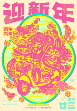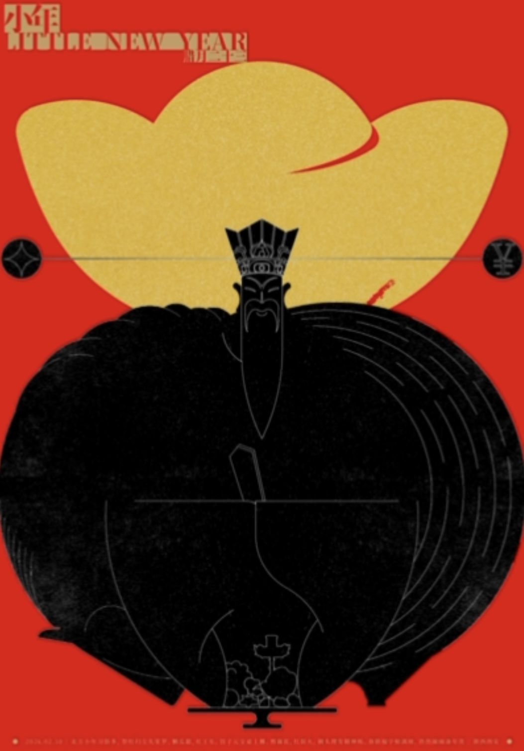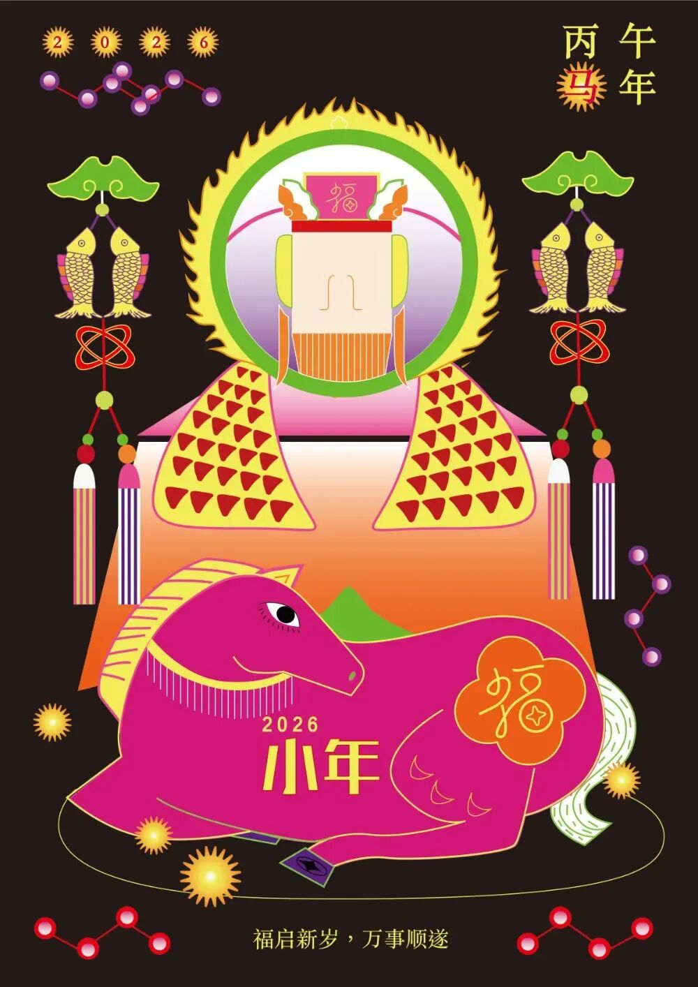 《马到灶安》保留了灶王爷的官帽、玉带等标志性元素,强化“祭灶王”这一北方小年核心习俗的视觉识别性,用简洁的几何线条与块面重构灶王爷的形象,贴合节日的仪式感,又符合当代平面设计的审美表达。