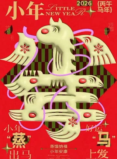 《马上有“馍”》以“小年‘蒸’出马,好运马上发”为核心创意,将“小年”字样解构为马形立体造型,结合陕西小年蒸馍纳福的习俗,以温润的米白色模拟蒸馍质感,背景采用红与墨绿棋盘格撞色,既呼应传统年味,又凸显视觉传达的设计张力。