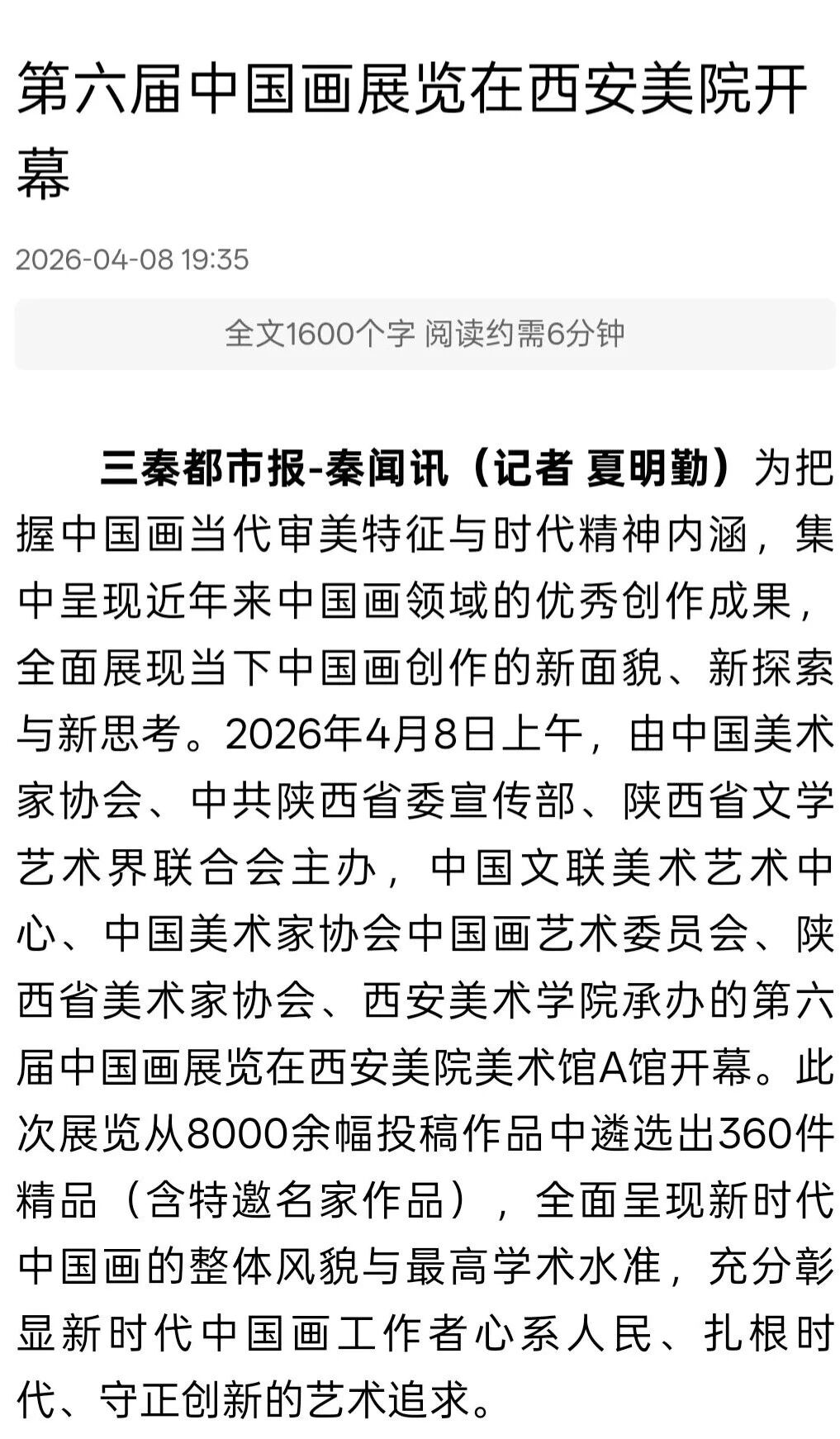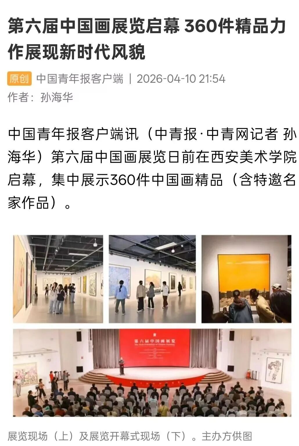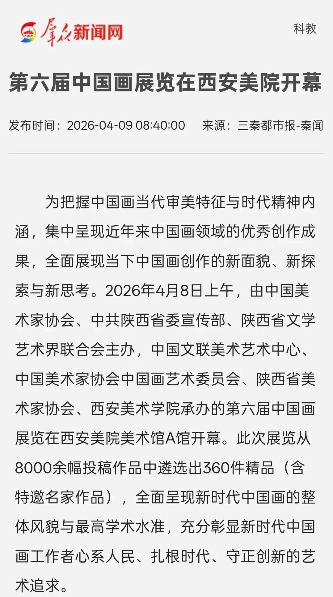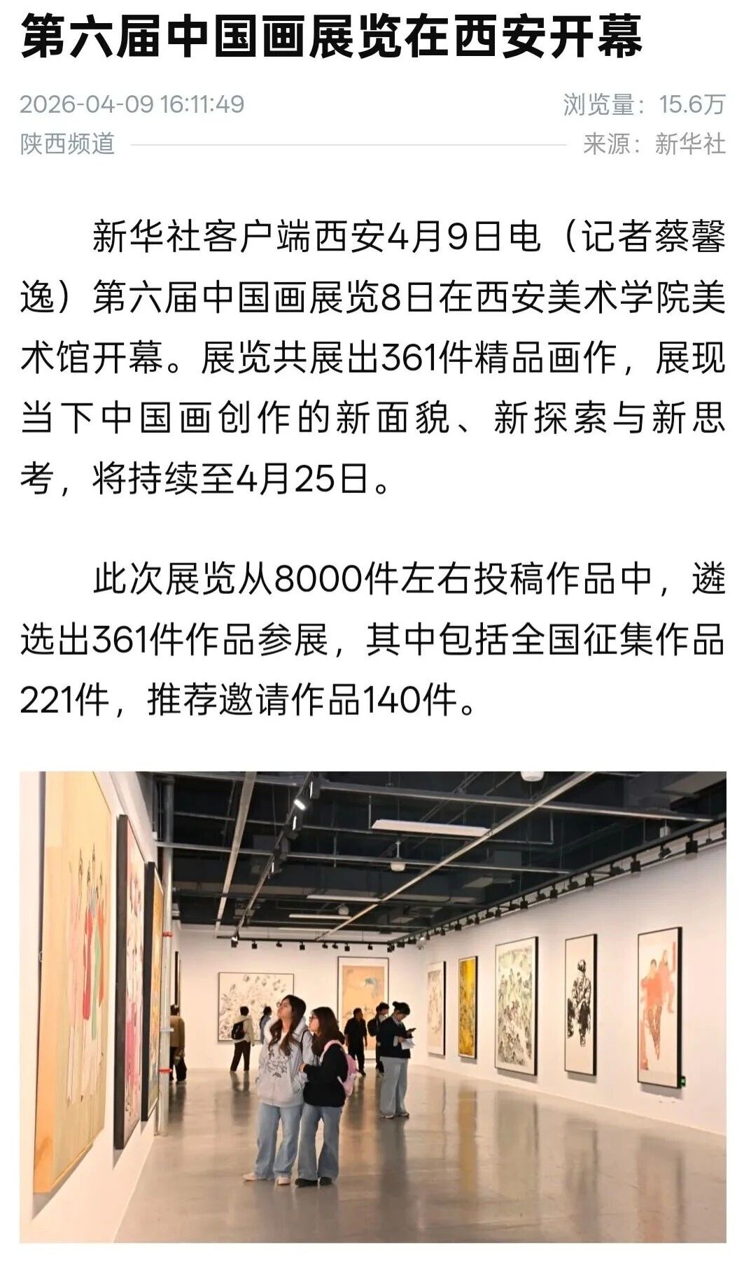 编者按:近日,“第六届中国画展览”在西安美术学院开幕,展览由中国美术家协会、中共陕西省委宣传部、陕西省文学艺术界联合会主办,中国文联美术艺术中心、中国美术家协会中国画艺术委员会、陕西省美术家协会、西安美术学院承办,集中呈现近年来中国画领域的优秀创作成果,从8000余幅投稿作品中遴选出360件精品(含特邀名家作品),全面呈现新时代中国画的整体风貌与最高学术水准,充分彰显新时代中国画工作者心系人民、扎根时代、守正创新的艺术追求。新华社、中新社、中国日报、中国青年报、中国网、中国教育新闻网、文旅中国、中国艺术报、陕西广电、群众新闻、三秦都市报、雅昌艺术网、ZAKER新闻等30余家媒体对展览活动进行了全程报道,引发了广泛的社会关注。具体报道如下: