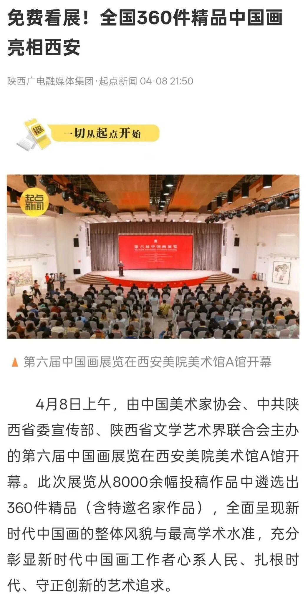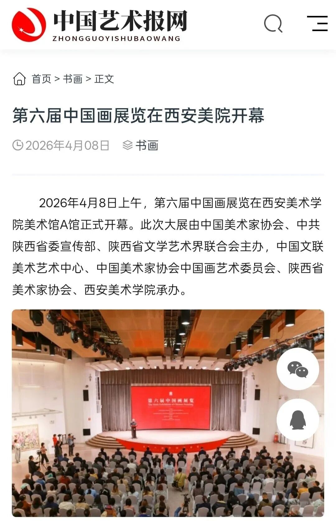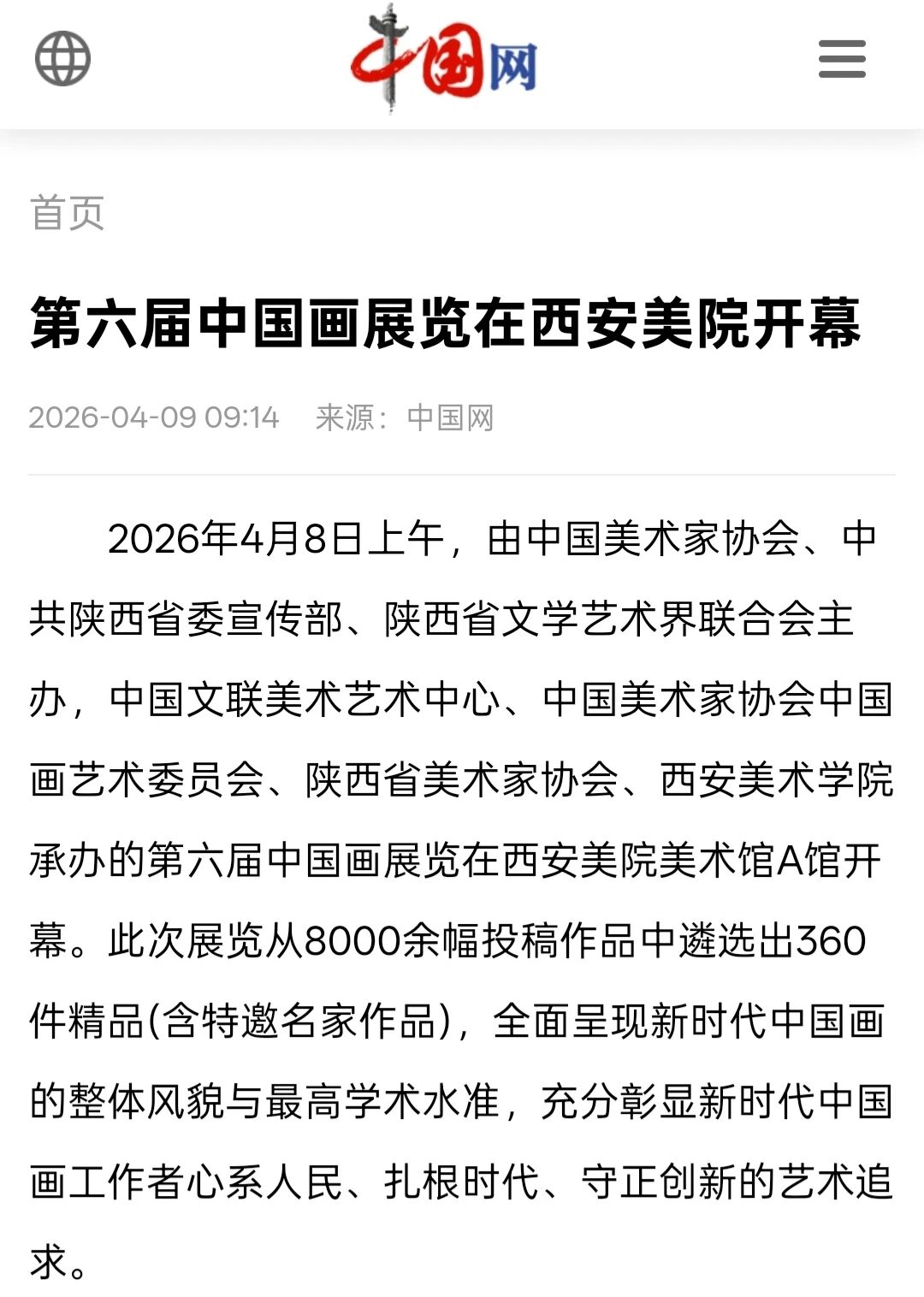 编者按:近日,“第六届中国画展览”在西安美术学院开幕,展览由中国美术家协会、中共陕西省委宣传部、陕西省文学艺术界联合会主办,中国文联美术艺术中心、中国美术家协会中国画艺术委员会、陕西省美术家协会、西安美术学院承办,集中呈现近年来中国画领域的优秀创作成果,从8000余幅投稿作品中遴选出360件精品(含特邀名家作品),全面呈现新时代中国画的整体风貌与最高学术水准,充分彰显新时代中国画工作者心系人民、扎根时代、守正创新的艺术追求。新华社、中新社、中国日报、中国青年报、中国网、中国教育新闻网、文旅中国、中国艺术报、陕西广电、群众新闻、三秦都市报、雅昌艺术网、ZAKER新闻等30余家媒体对展览活动进行了全程报道,引发了广泛的社会关注。具体报道如下: