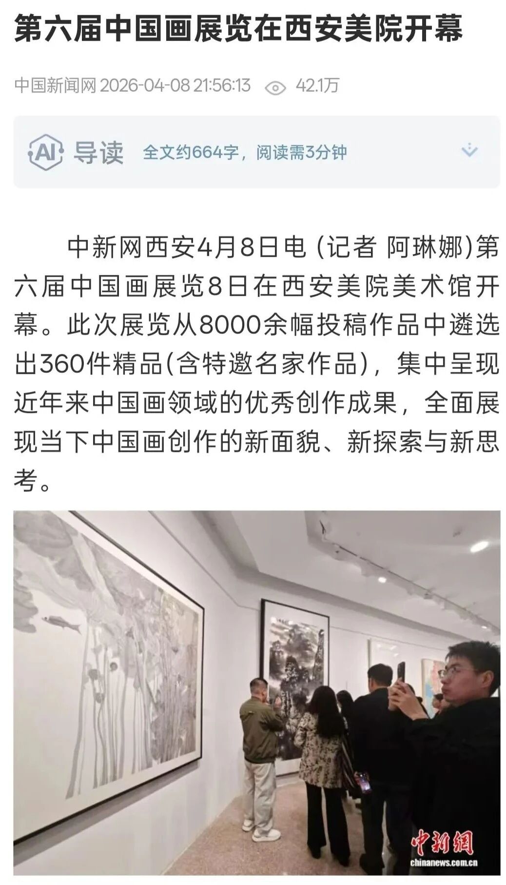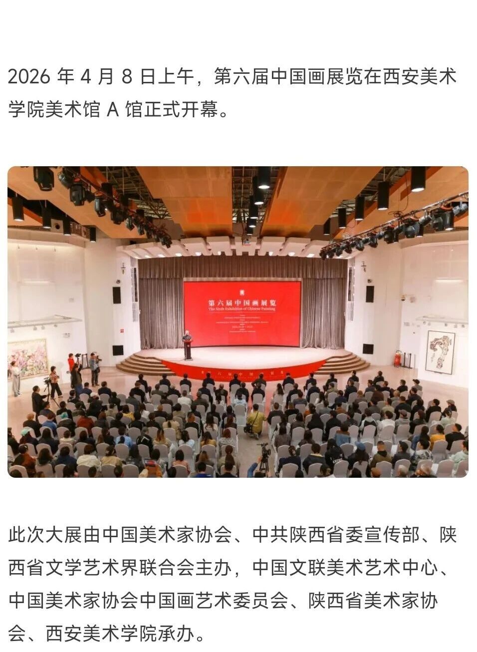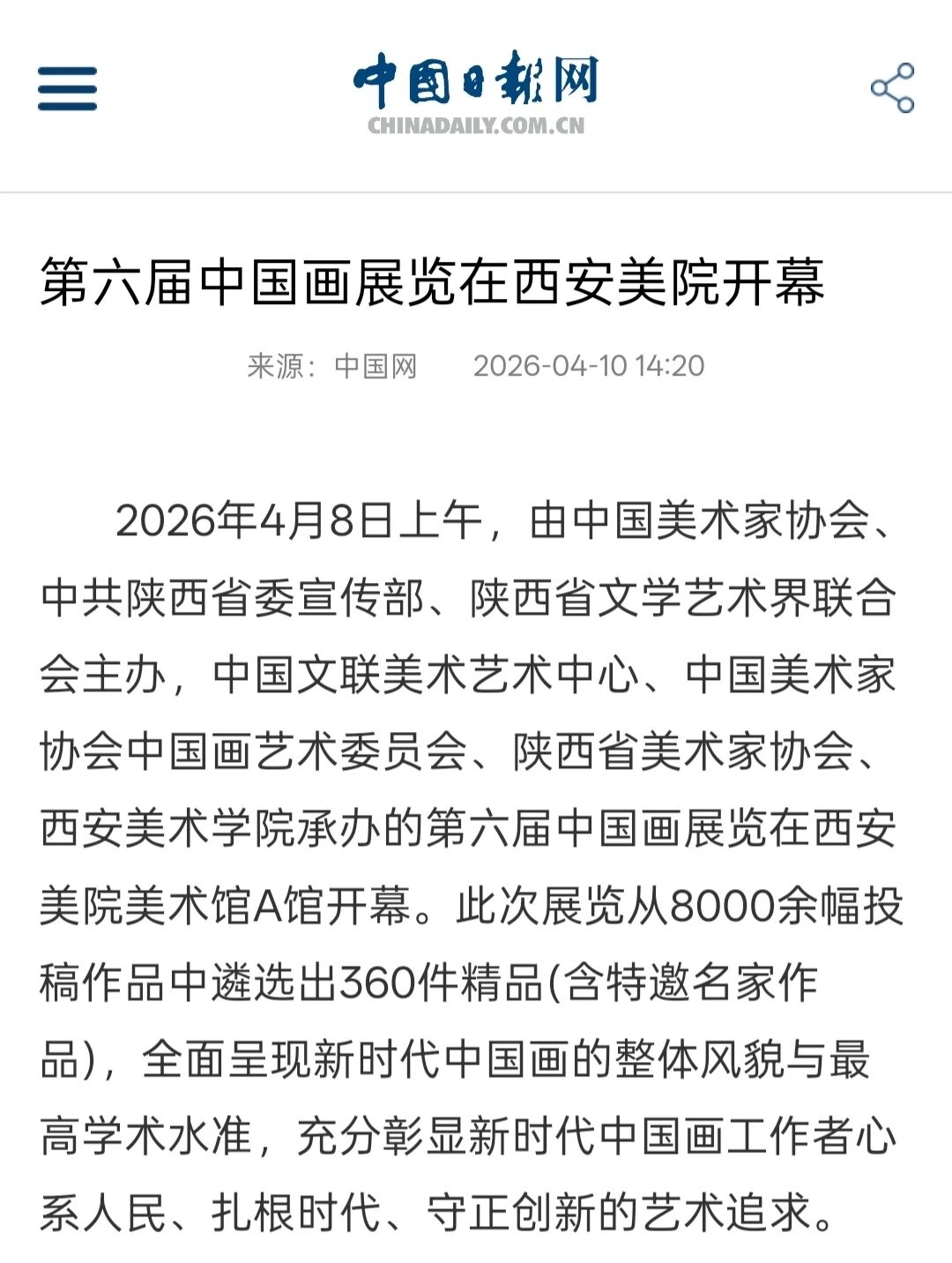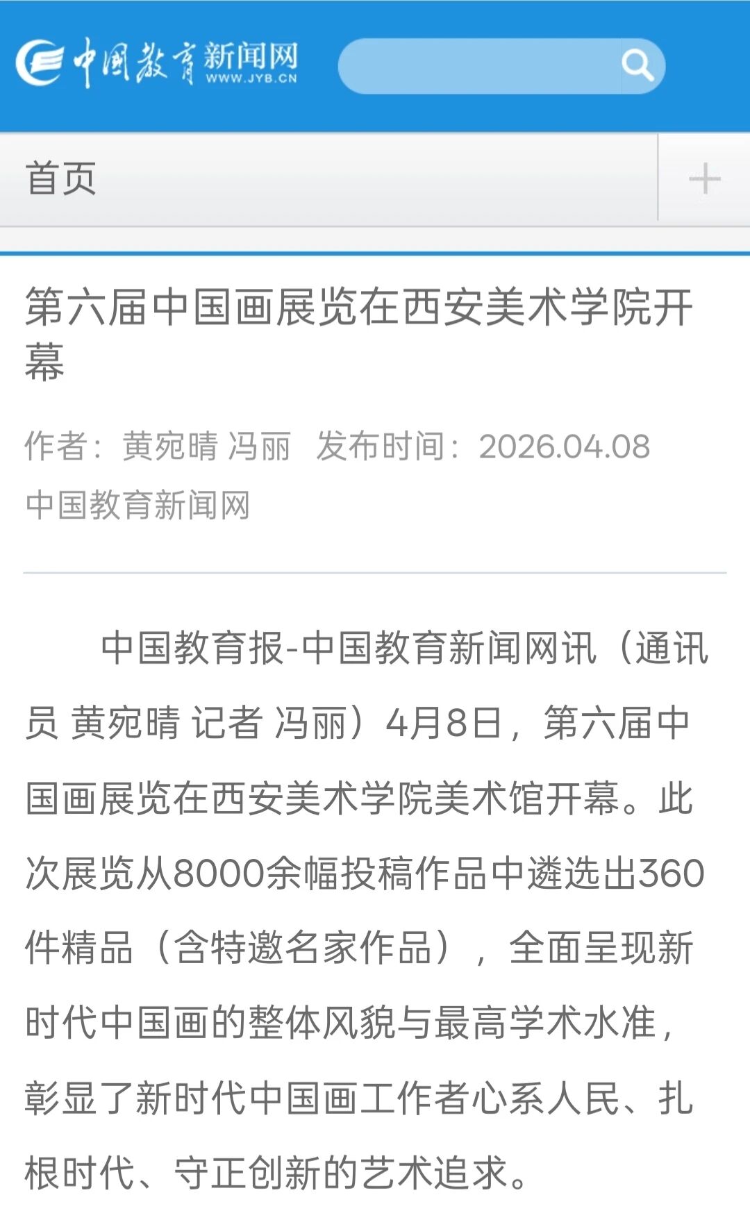 编者按:近日,“第六届中国画展览”在西安美术学院开幕,展览由中国美术家协会、中共陕西省委宣传部、陕西省文学艺术界联合会主办,中国文联美术艺术中心、中国美术家协会中国画艺术委员会、陕西省美术家协会、西安美术学院承办,集中呈现近年来中国画领域的优秀创作成果,从8000余幅投稿作品中遴选出360件精品(含特邀名家作品),全面呈现新时代中国画的整体风貌与最高学术水准,充分彰显新时代中国画工作者心系人民、扎根时代、守正创新的艺术追求。新华社、中新社、中国日报、中国青年报、中国网、中国教育新闻网、文旅中国、中国艺术报、陕西广电、群众新闻、三秦都市报、雅昌艺术网、ZAKER新闻等30余家媒体对展览活动进行了全程报道,引发了广泛的社会关注。具体报道如下: